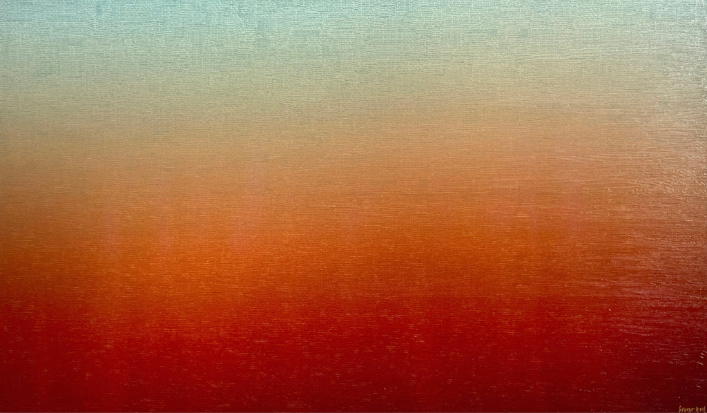 Ambient Dusk by George Hall is a mixed media work, incorporating polymer inks, acrylic paint and polymer glazing. This artwork is designed to induce calmness and peace creating a serene and tranquil atmosphere. I’ve used soft, gentle hues to evoke a soothing ambiance. This artwork features a gentle gradient that blends harmoniously, promoting a sense of relaxation and serenity. If you look closely, I have used positive and motivational words layered over each other in this artwork. I have a rule that only positive art goes on my wall. The positive words are a counter play to all the negativity surrounding what the world is going through. I wanted to create a sense of flight and movement, a feeling of growing and moving forward.
