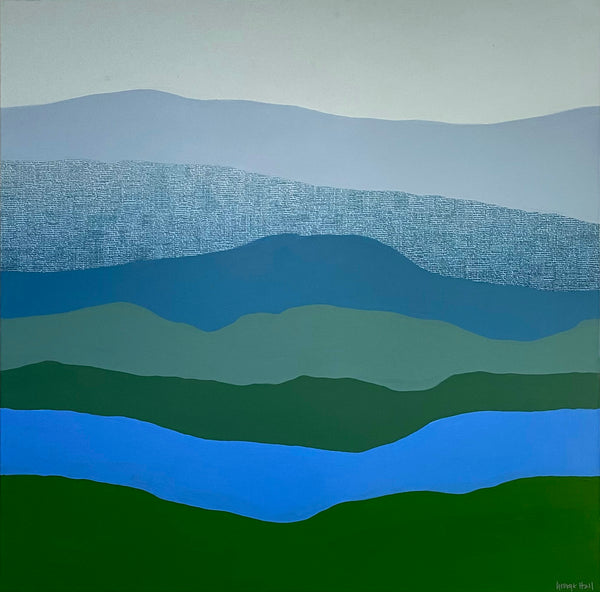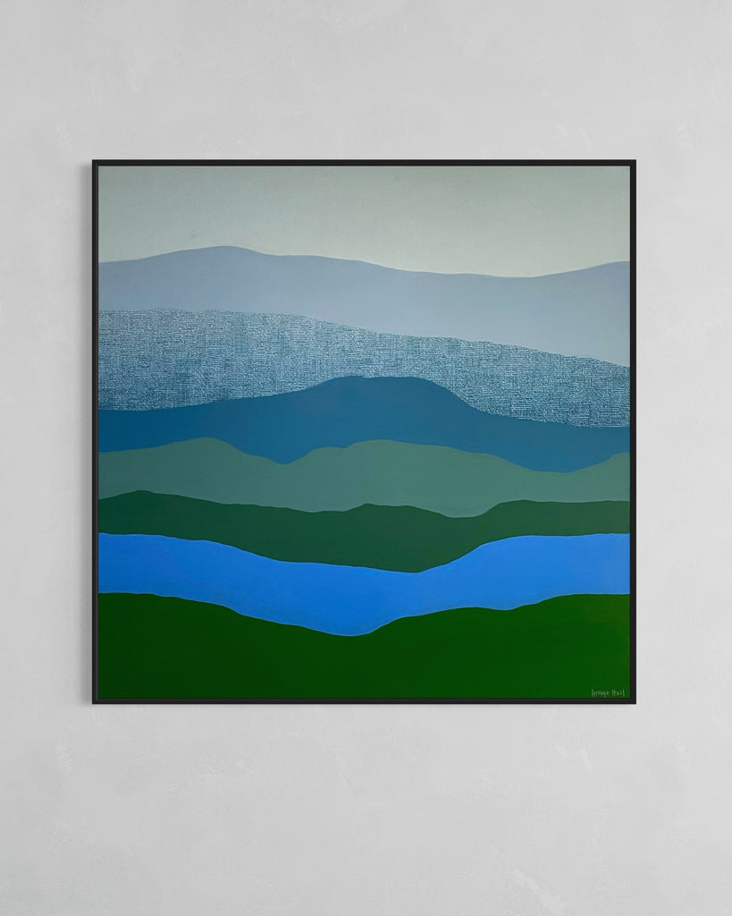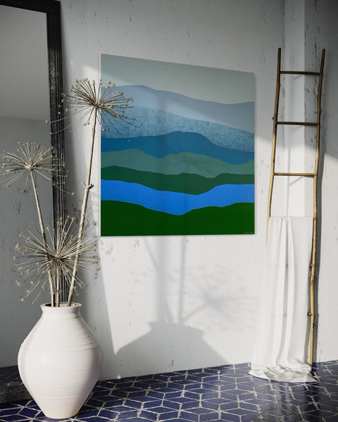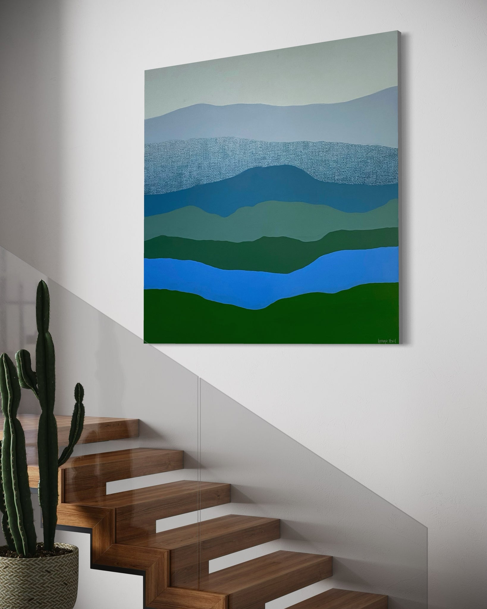 Acrylic painting on archival canvas captures the vast openness of the landscape, where rolling hills give way to distant peaks, stretching the eye beyond the present moment. The layering of color and texture creates a sense of depth, drawing the viewer into a space that feels expansive and unbounded. Subtle tonal shifts guide the gaze from shadowed foregrounds to softened, atmospheric distances, evoking the quiet stillness of a place only touched time. One of the Mountains is made up of printed positive words, creating it's gradiant and a sense of calm.