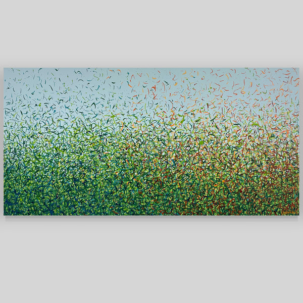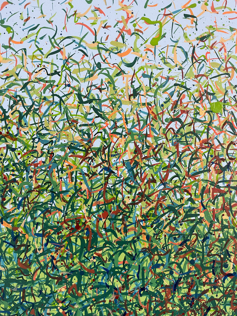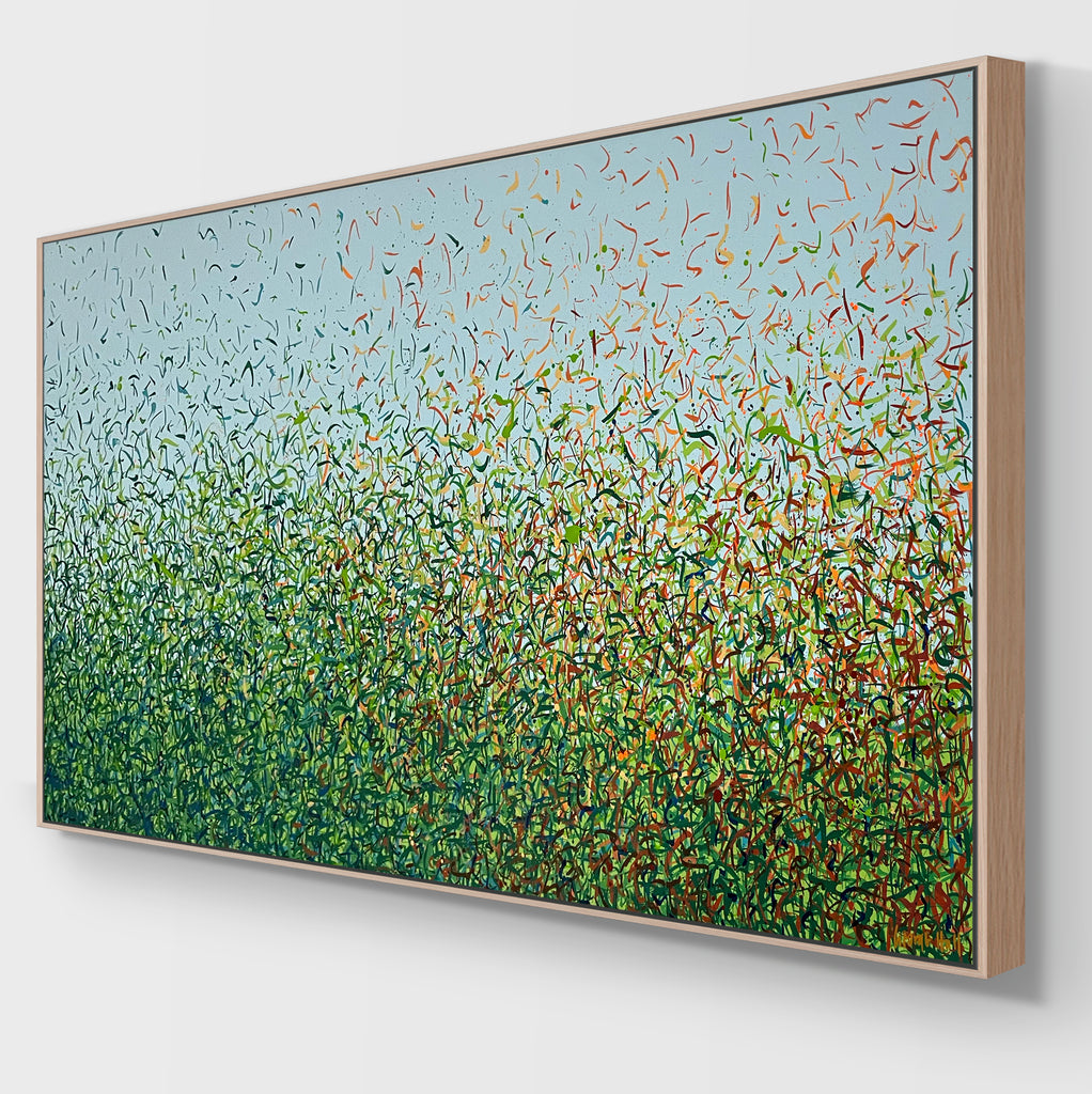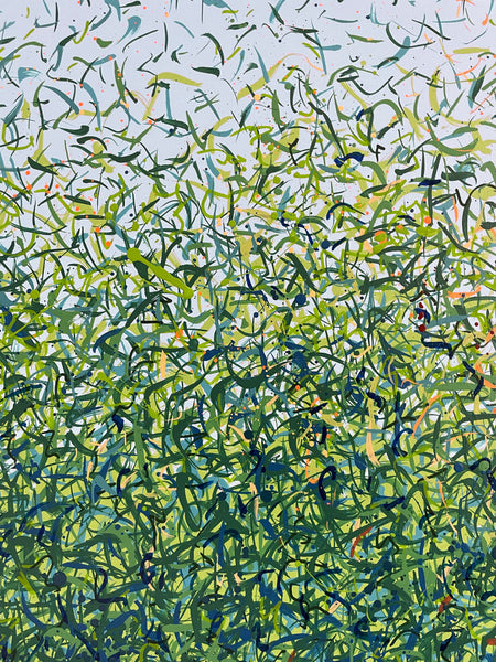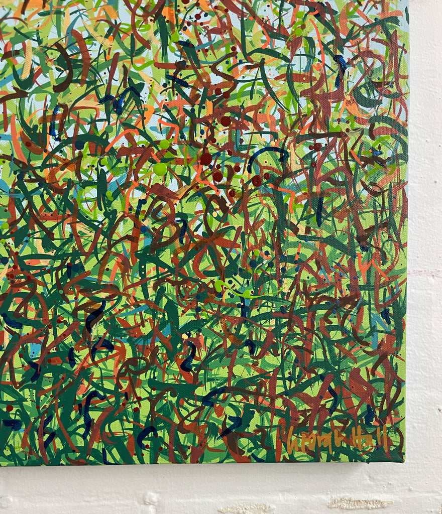 'Katoomba Dance' is a very detailed painting with colour crossing over one another to create effect. A painting to express how nature is free to do whatever it wants, without expectations. This work is specific to the colours of an the Australian bush and how they intertwine creating a dance of their own. It is not intended to be too literal and so allows you to see whatever you can find.