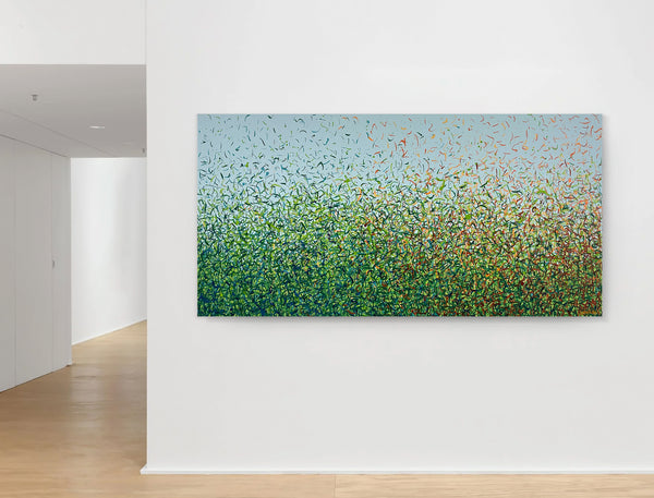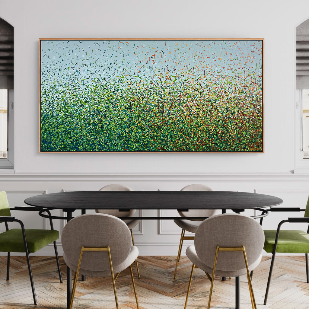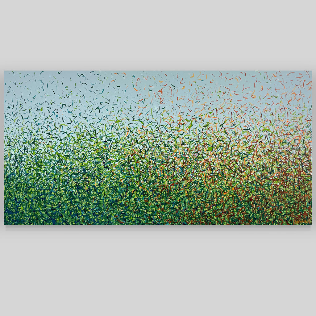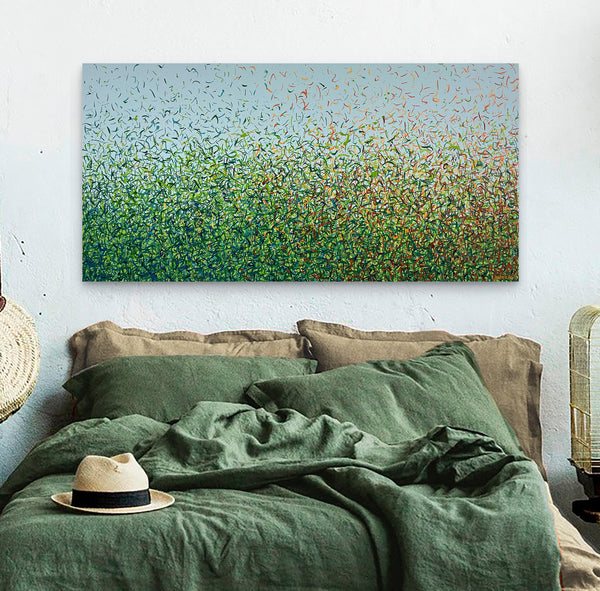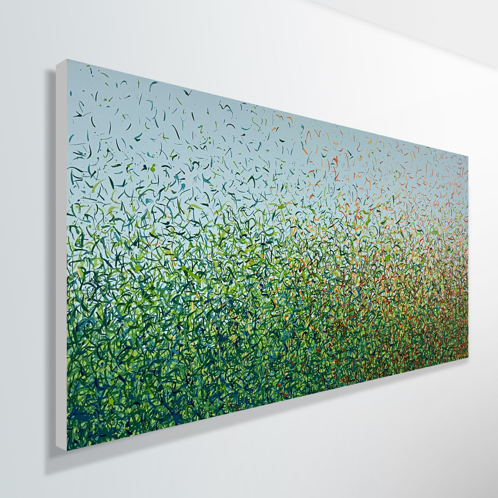 'Katoomba Dance' is a very detailed painting with colour crossing over one another to create effect. A painting to express how nature is free to do whatever it wants, without expectations. This work is specific to the colours of an the Australian bush and how they intertwine creating a dance of their own. It is not intended to be too literal and so allows you to see whatever you can find.