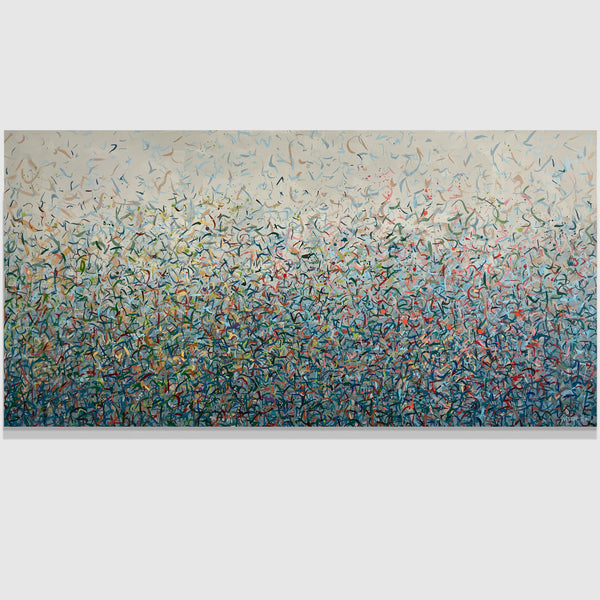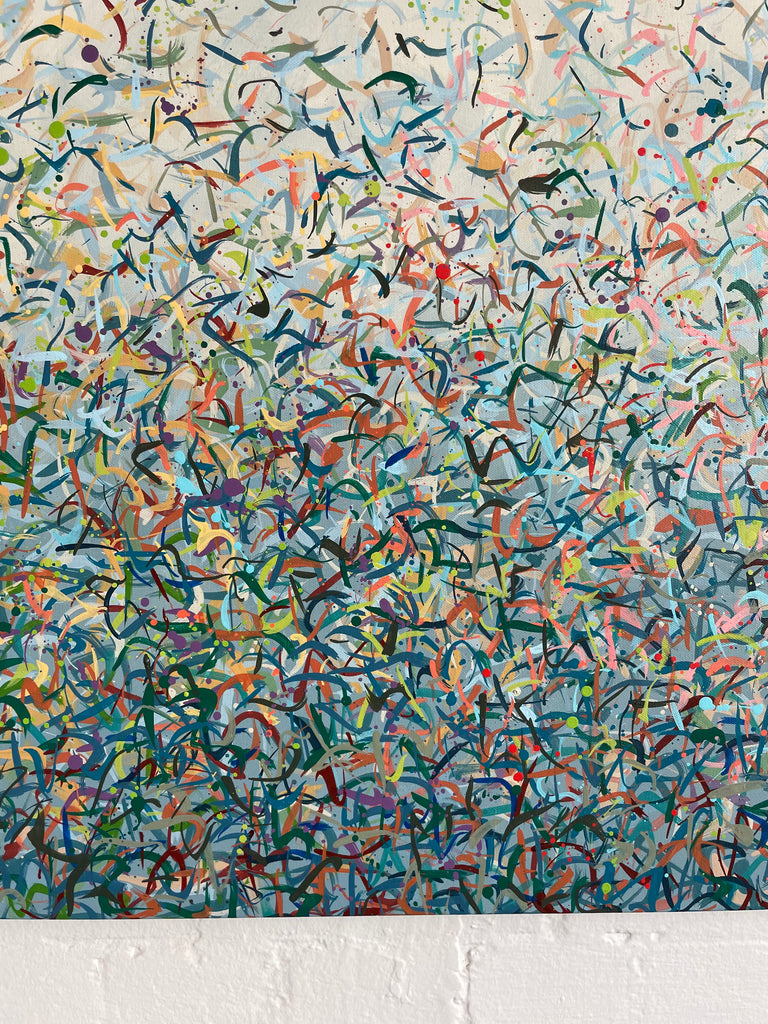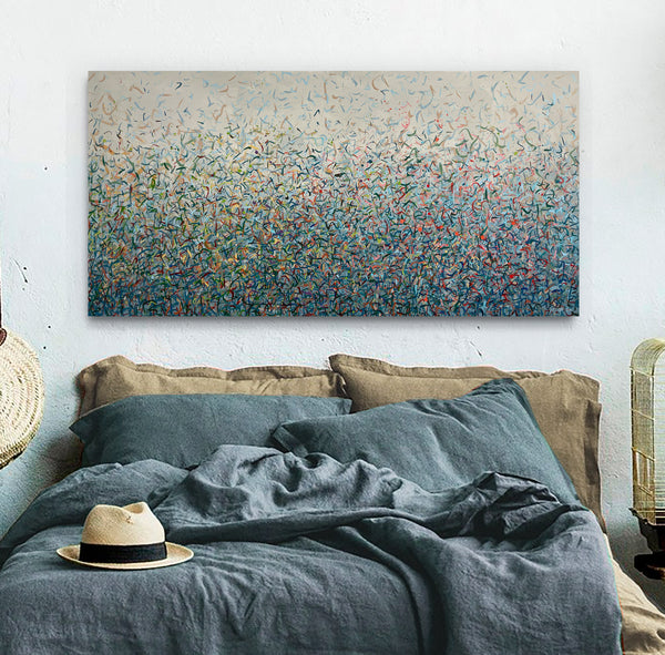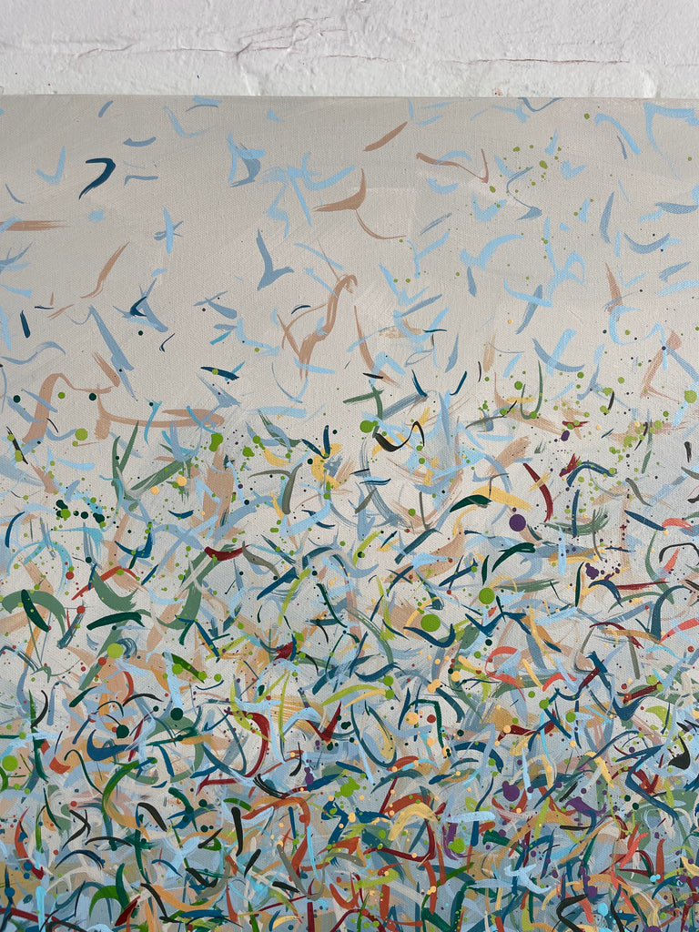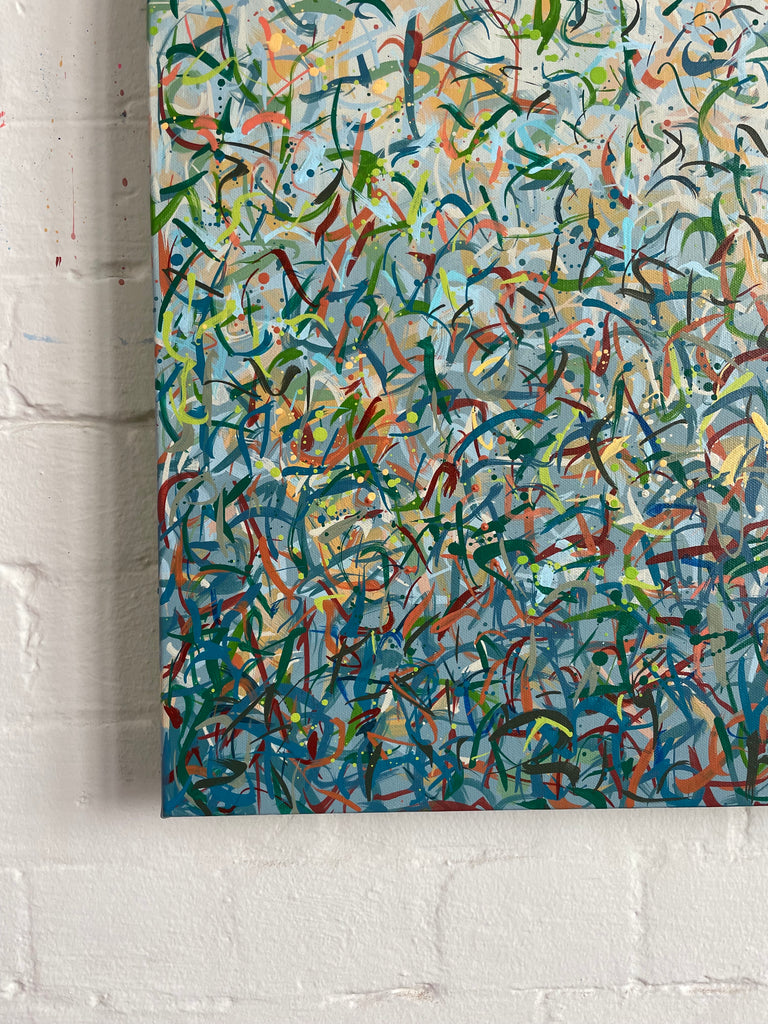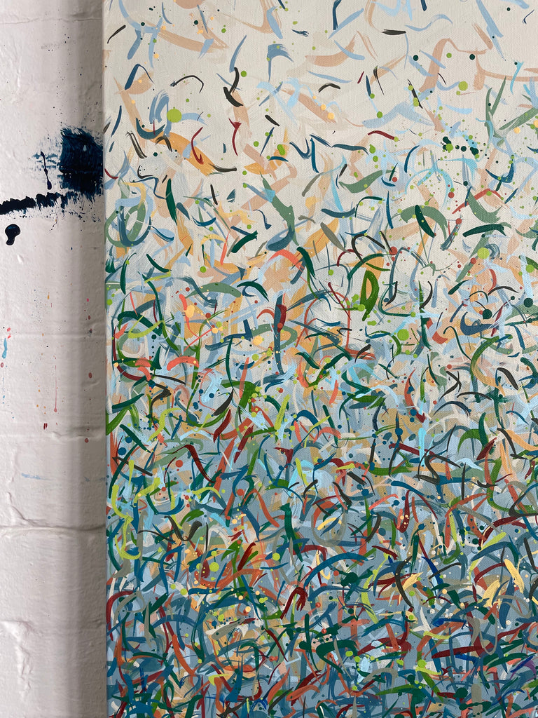 'Nature's Dusk' is a very detailed painting with colour crossing over one another to create effect. A painting to express how nature is free to do whatever it wants, without expectations. This work is specific to the colours of an Australian garden at dush and how they intertwine creating a dance of their own. It is not intended to be too literal and so allows you to see whatever you can find.