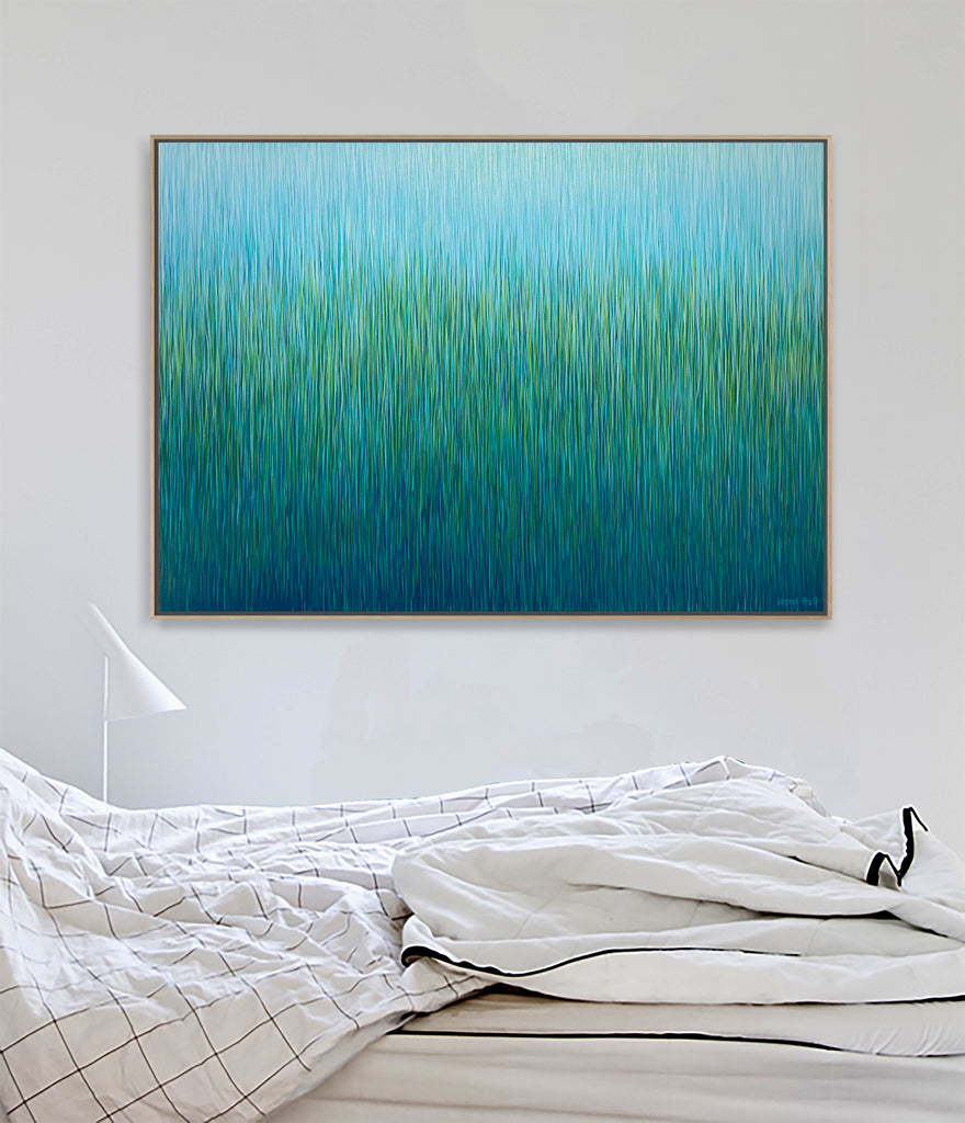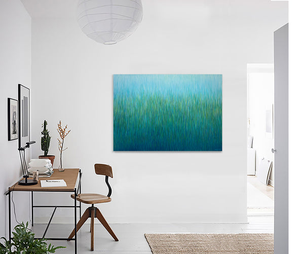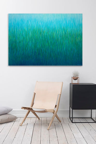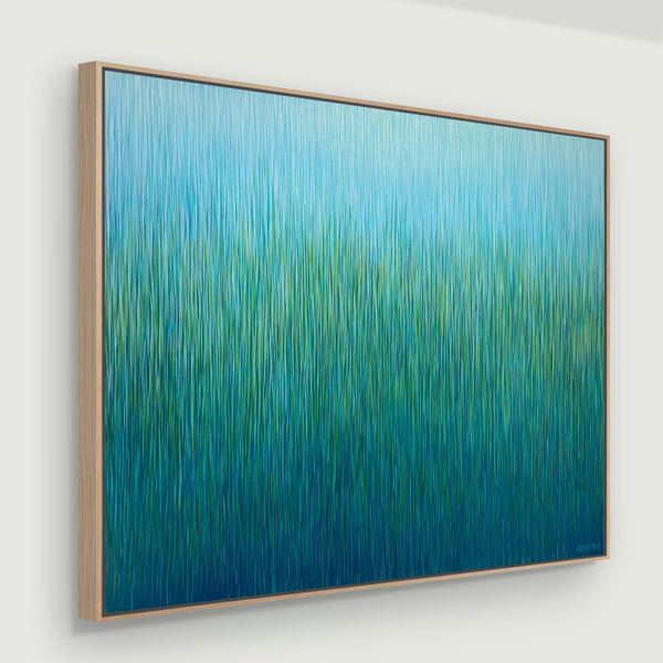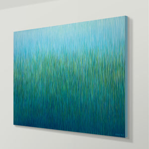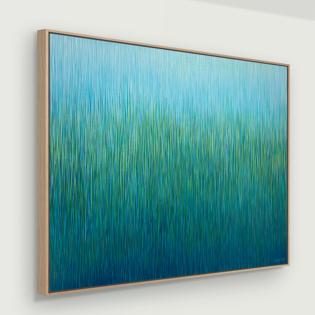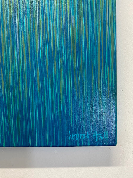 Silent Grass by George Hall. This painting is part of a series called Rain in Paradise. It always makes me feel calm to paint, it is a very meditative process. Signed on the right hand side, an archival canvas and paints, and has UV protected vanish, so will not fade in direct sunlight.