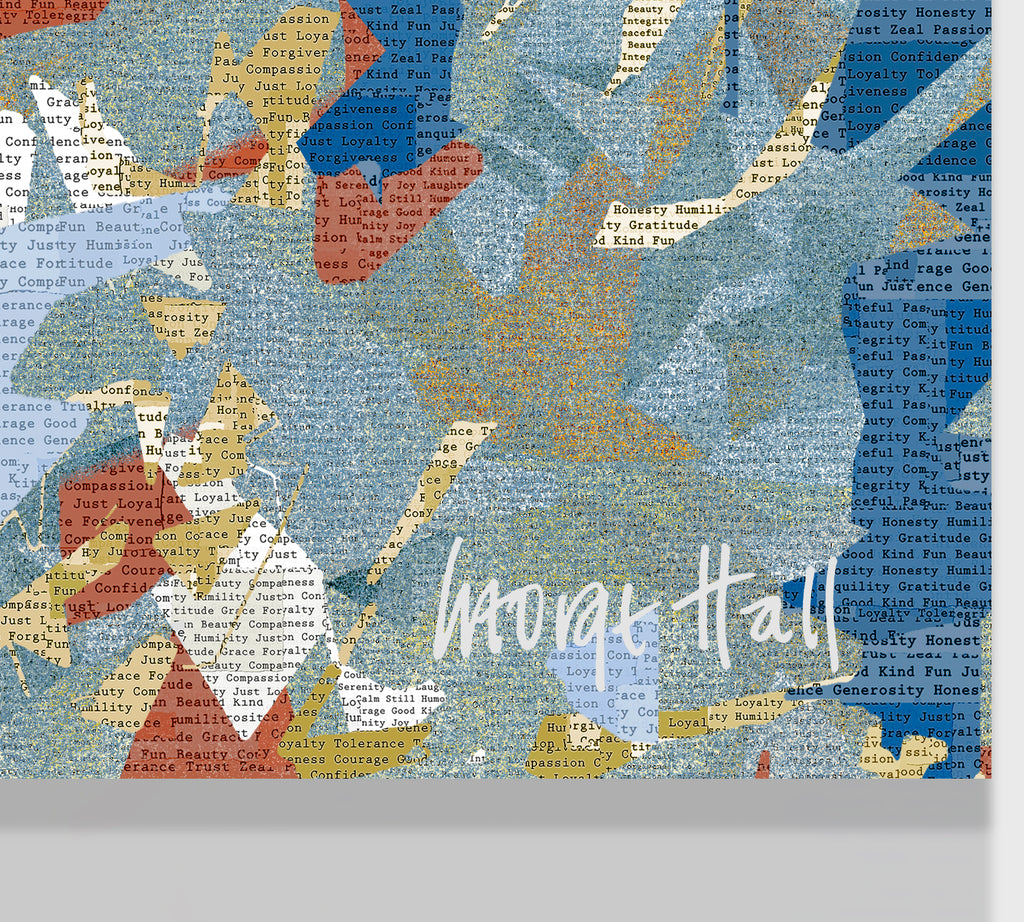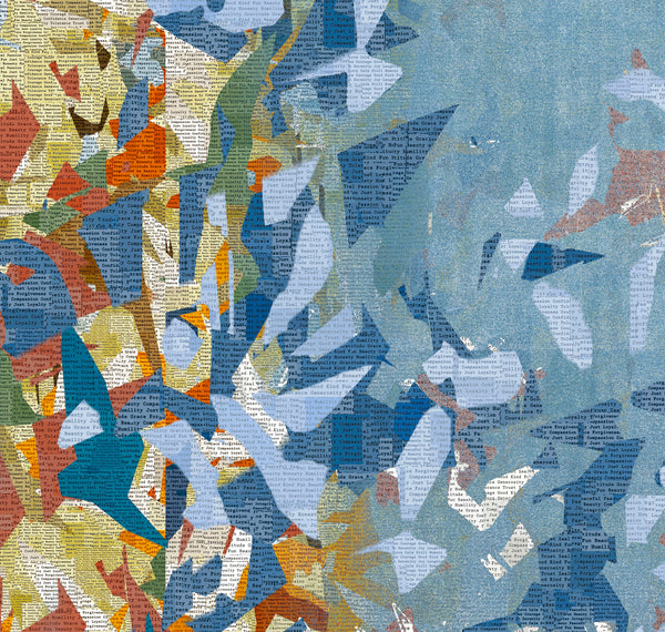 'Harbour News', some days I just want to create a big colourful artwork. All the newsprint are made up of positive words, please look at the detailed photos to see this. I wanted to create the feeling of flight and movement to spread positivity and joy rather than what we seem to get in the news.