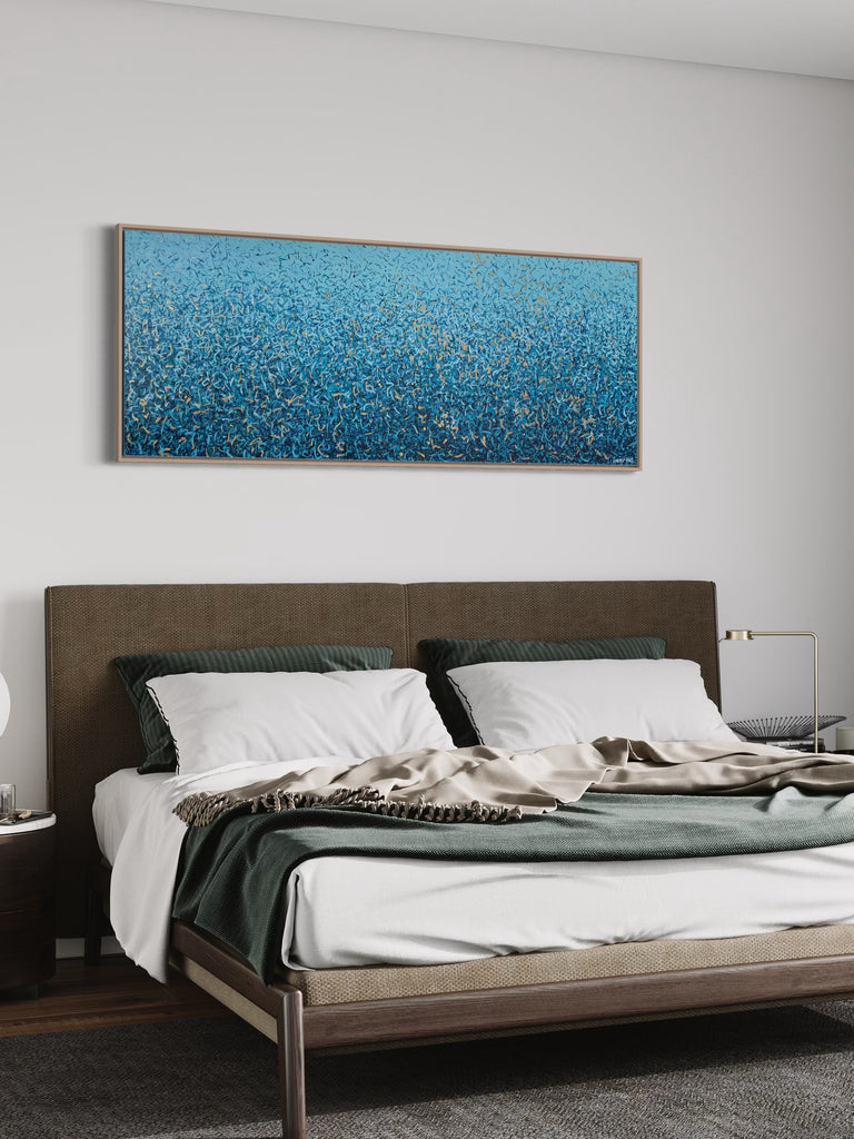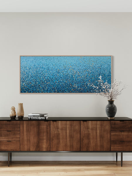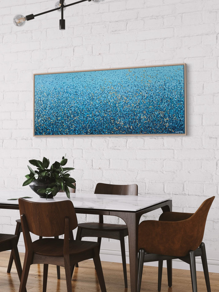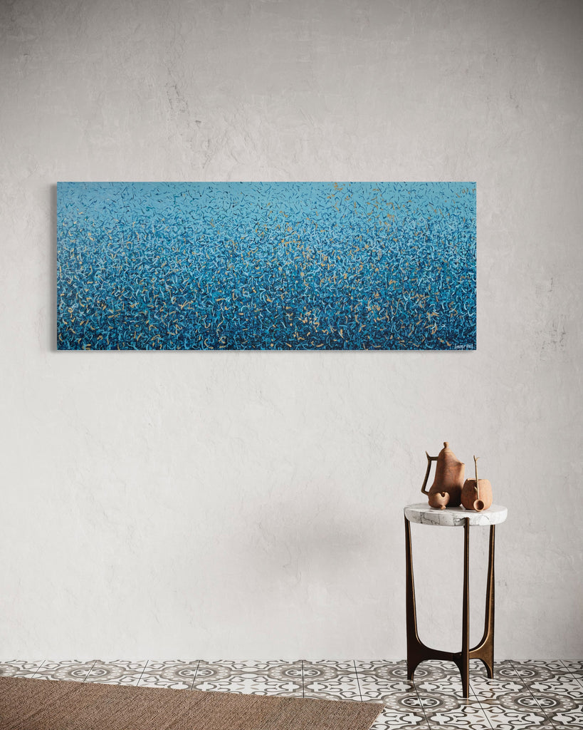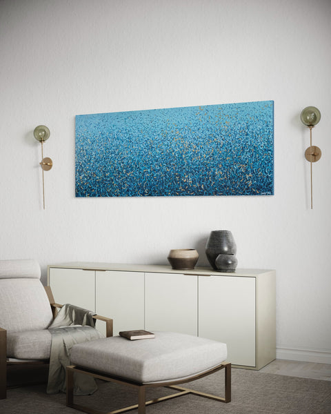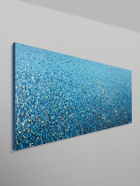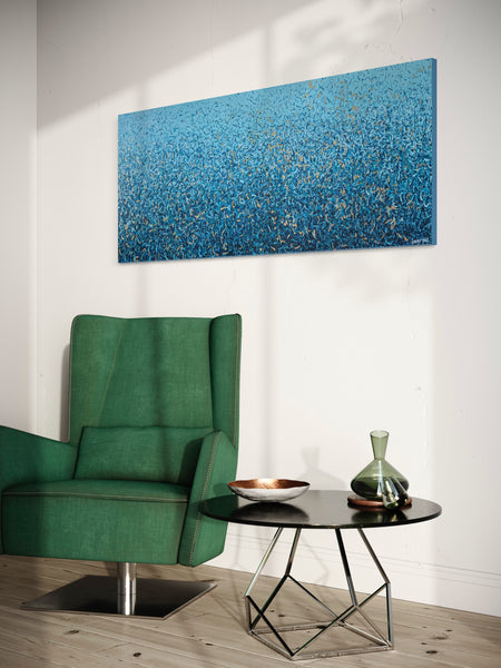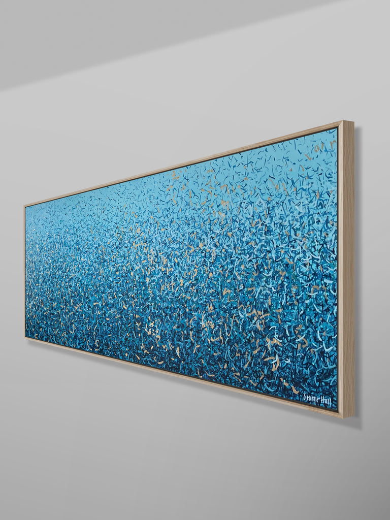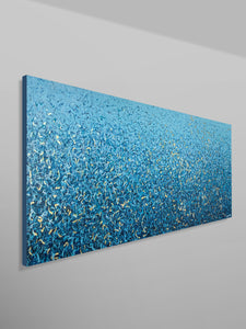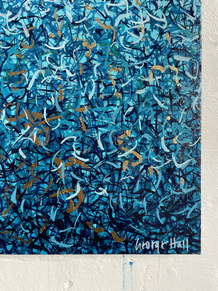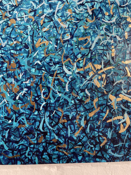 'Peaceful Waters' is a painting that was inspired by Australian Beaches. It is a detailed painting with colour crossing over one another to create effect. This is a painting to express how nature is free to do whatever it wants, without expectations. It is specific to the colours of Australian beaches and how they intertwine creating a dance of their own. It is not intended to be too literal and so allows you to see whatever you can find. I have used gold highlights to give it an impression of the water glistening in the sun.
