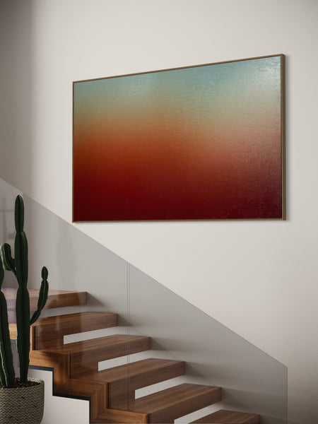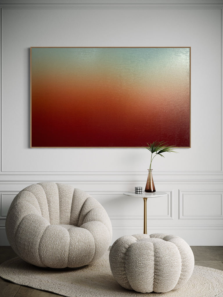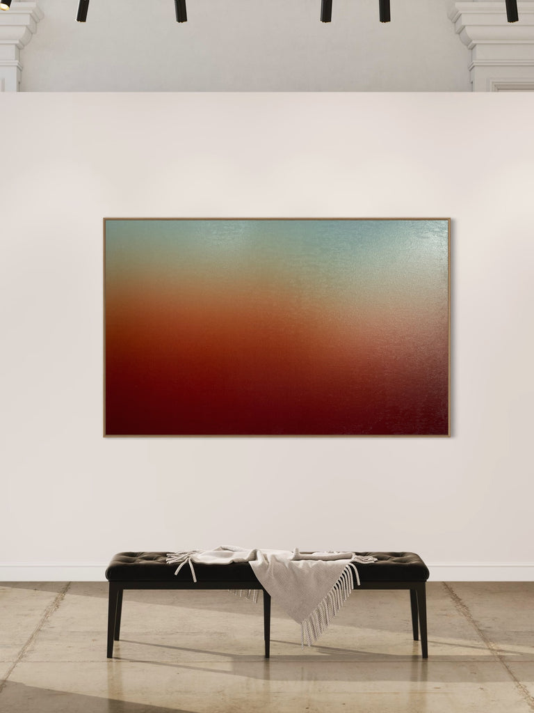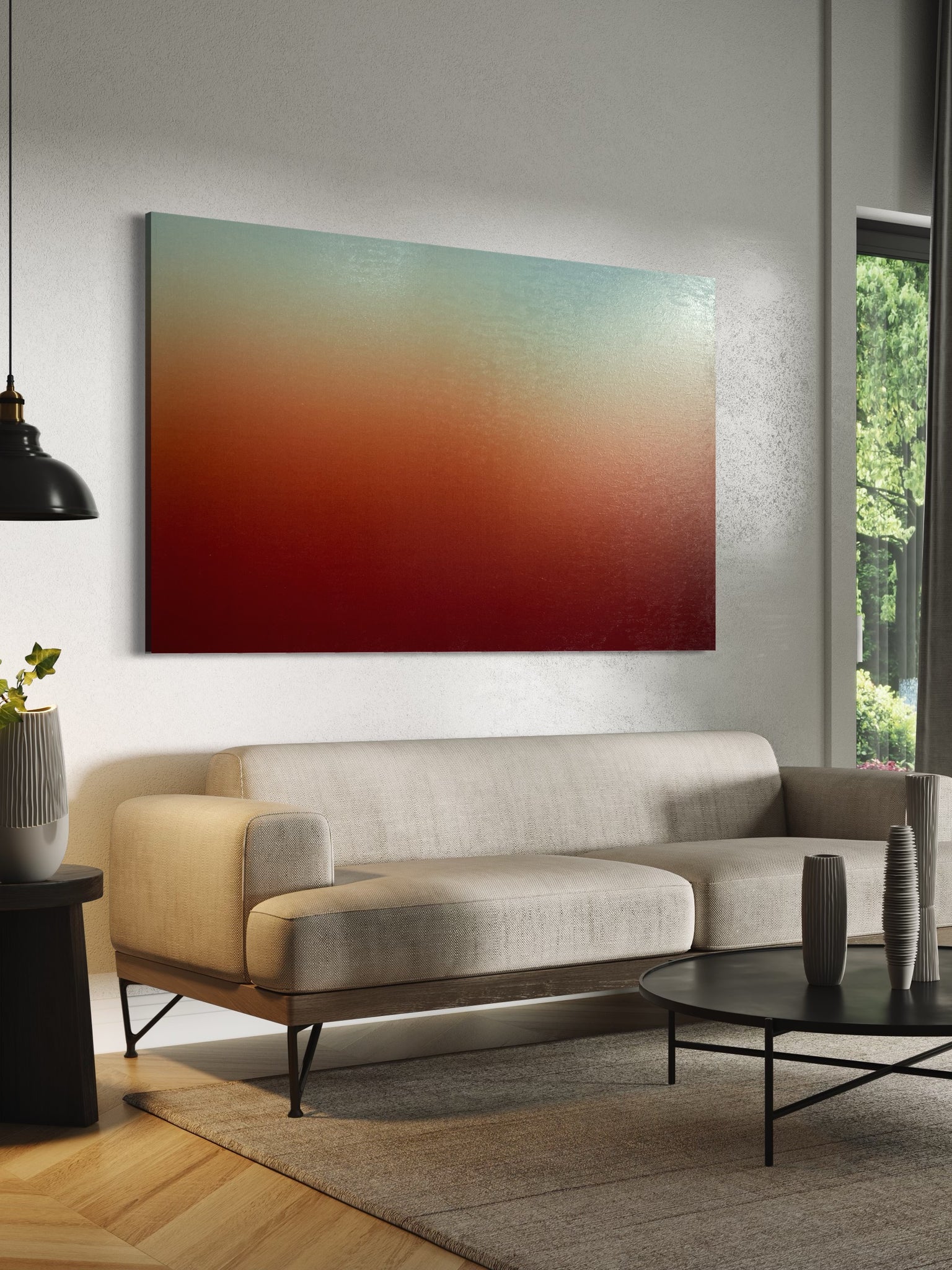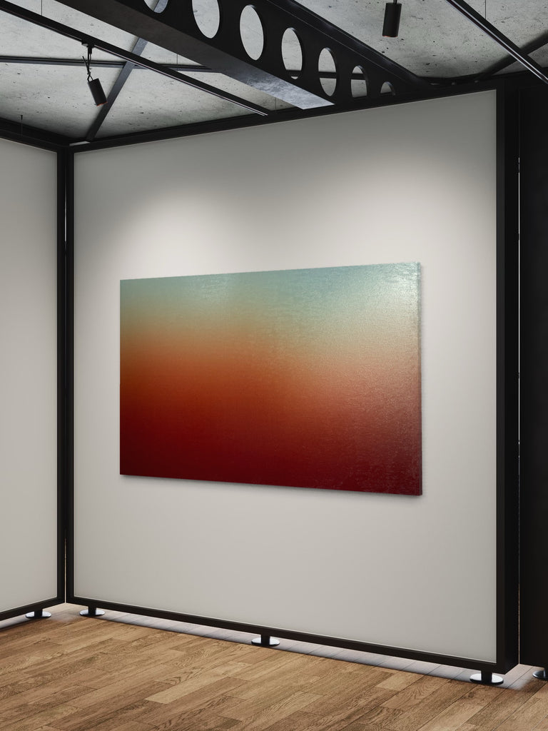 Ambient Day Dream by George Hall is a mixed media work, incorporating polymer inks, acrylic paint and  polymer glazing. This artwork is designed to induce calmness and peace creating a serene and tranquil atmosphere. I’ve used soft, gentle hues to evoke a soothing ambiance. This artwork features a gentle gradient that blends harmoniously, promoting a sense of relaxation and serenity. If you look closely, I have used positive and motivational words layered over each other in this artwork. I have a rule that only positive art goes on my wall. The positive words are a counter play to all the negativity surrounding what the world is going through. I wanted to create a sense of flight and movement, a feeling of growing and moving forward.