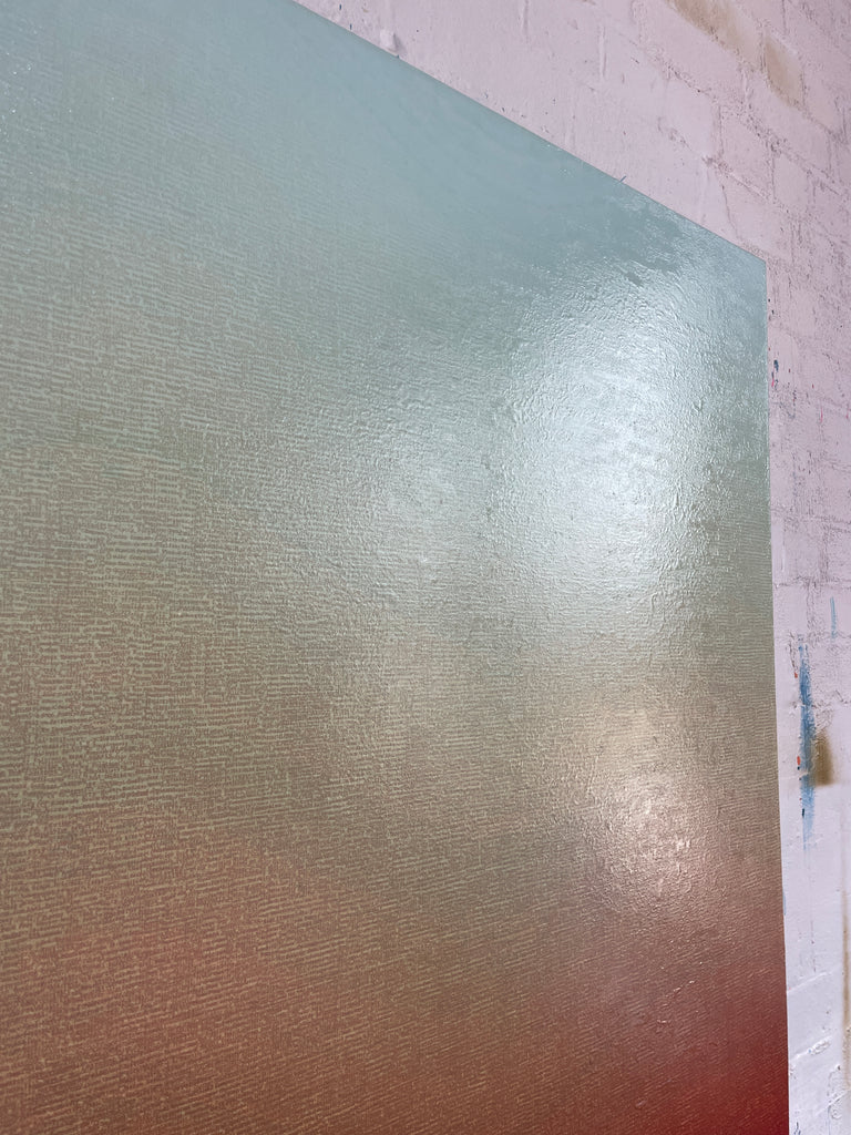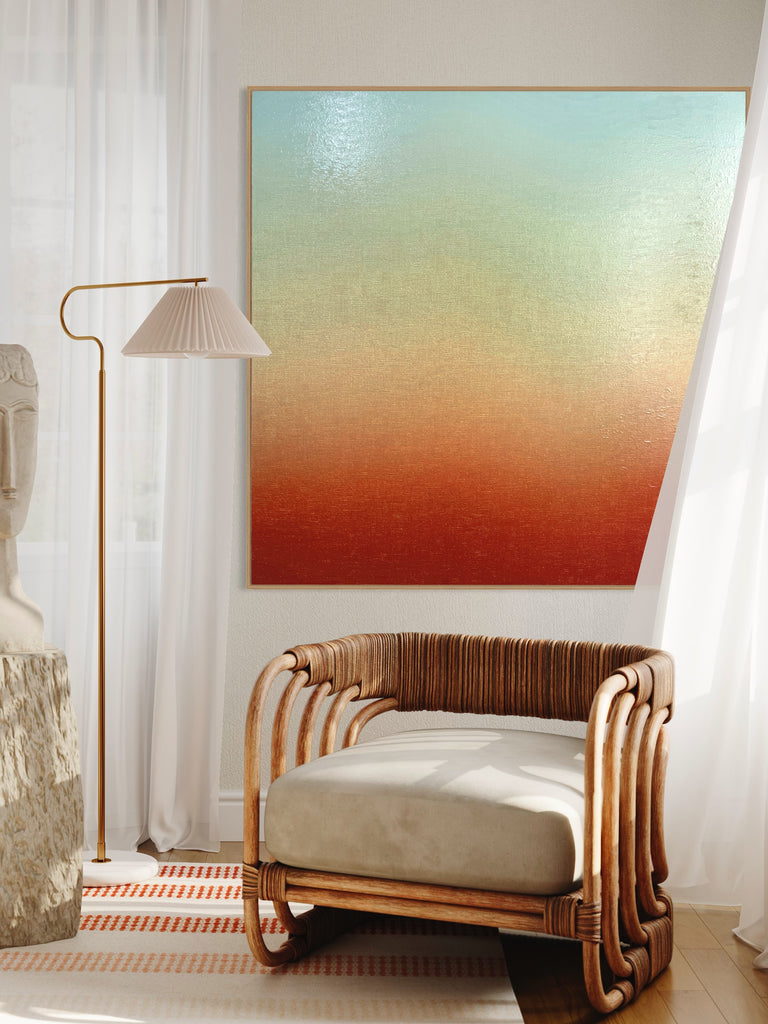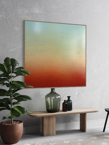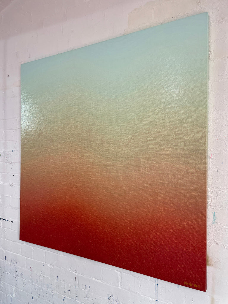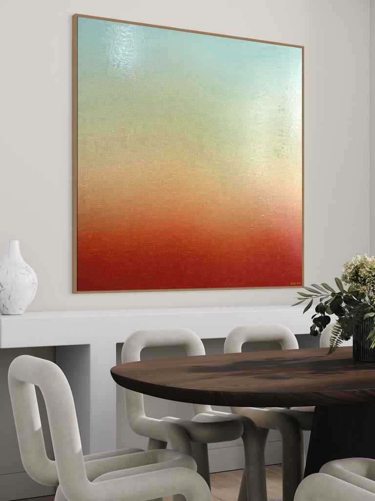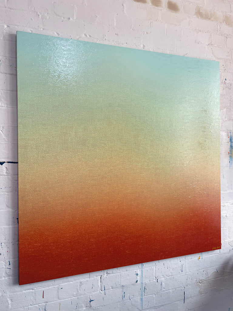 ‘Ambient Sun’ by George Hall is a mixed media work, incorporating polymer inks, acrylic paint and  polymer glazing. This artwork is designed to induce calmness and peace creating a serene and tranquil atmosphere. I’ve used soft, gentle hues to evoke a soothing ambiance. This artwork features a gentle gradient that blends harmoniously, promoting a sense of relaxation and serenity. If you look closely, I have used positive and motivational words layered over each other in this artwork. I have a rule that only positive art goes on my wall. The positive words are a counter play to all the negativity surrounding what the world is going through. I wanted to create a sense of flight and movement, a feeling of growing and moving forward.