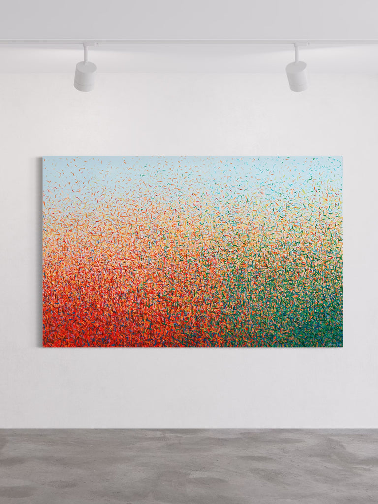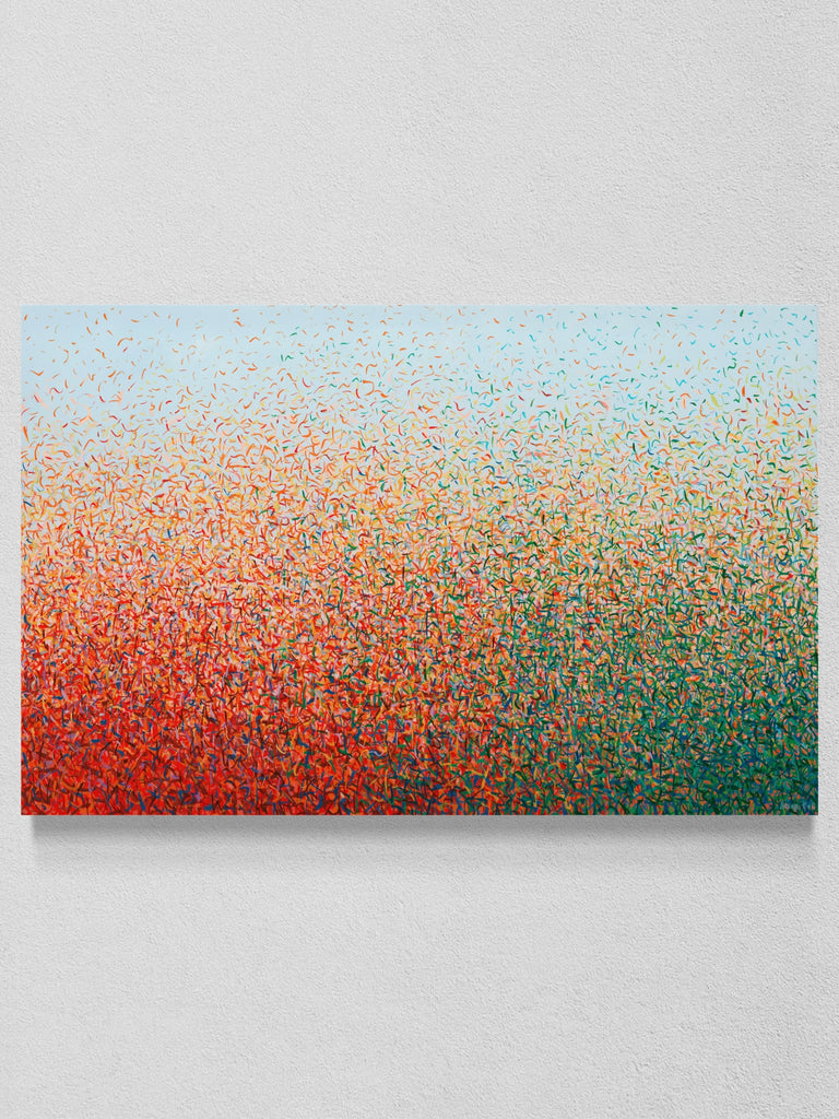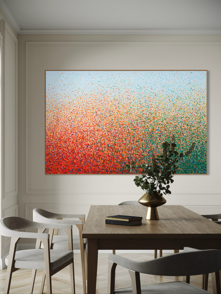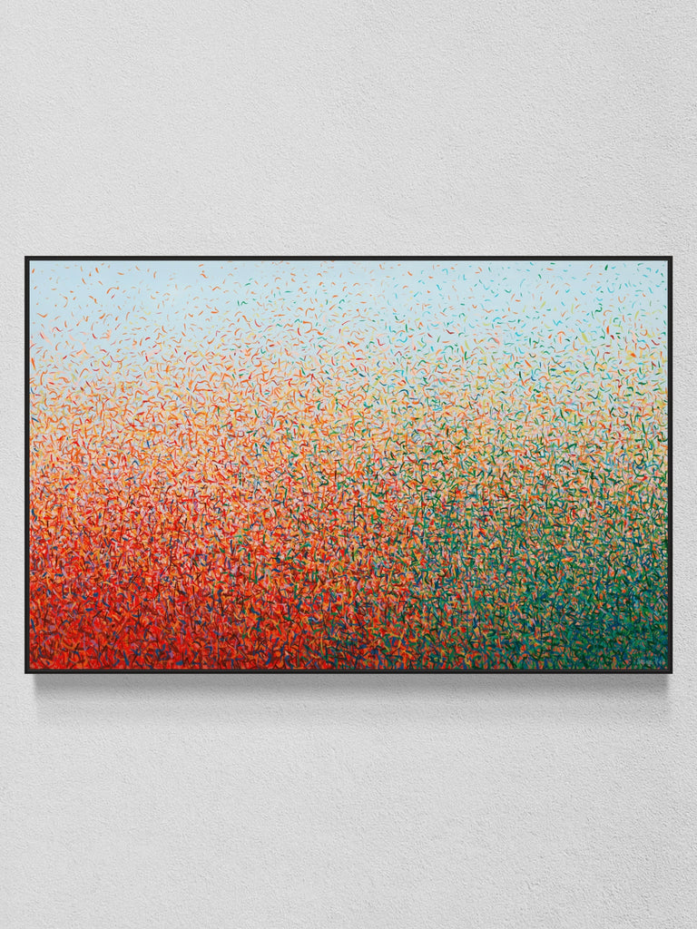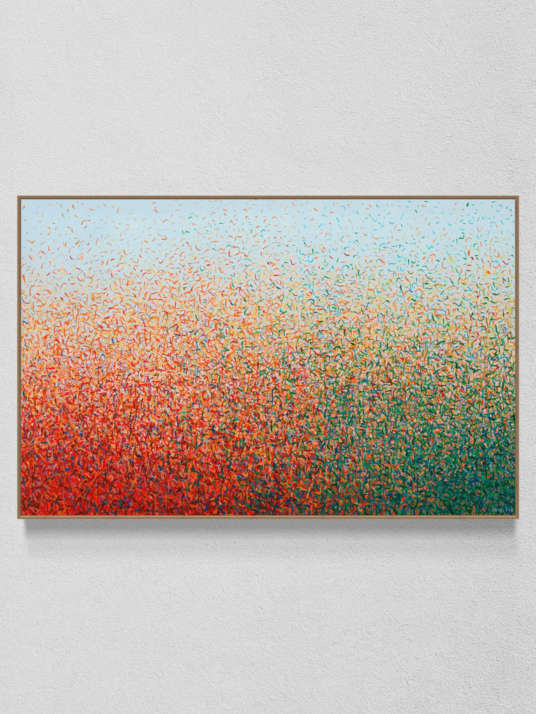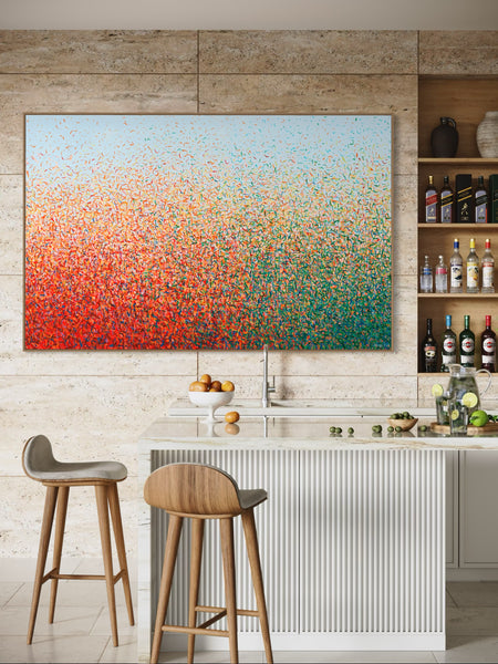 'Australia's Rhythm' is a very detailed painting with colour crossing over one another to create effect. A painting to express how nature is free to do whatever it wants, without expectations. This work is specific to the colours of Uluru in the Northern Territory and how they intertwine creating a dance of their own. It is not intended to be too literal and so allows you to see whatever you can find.