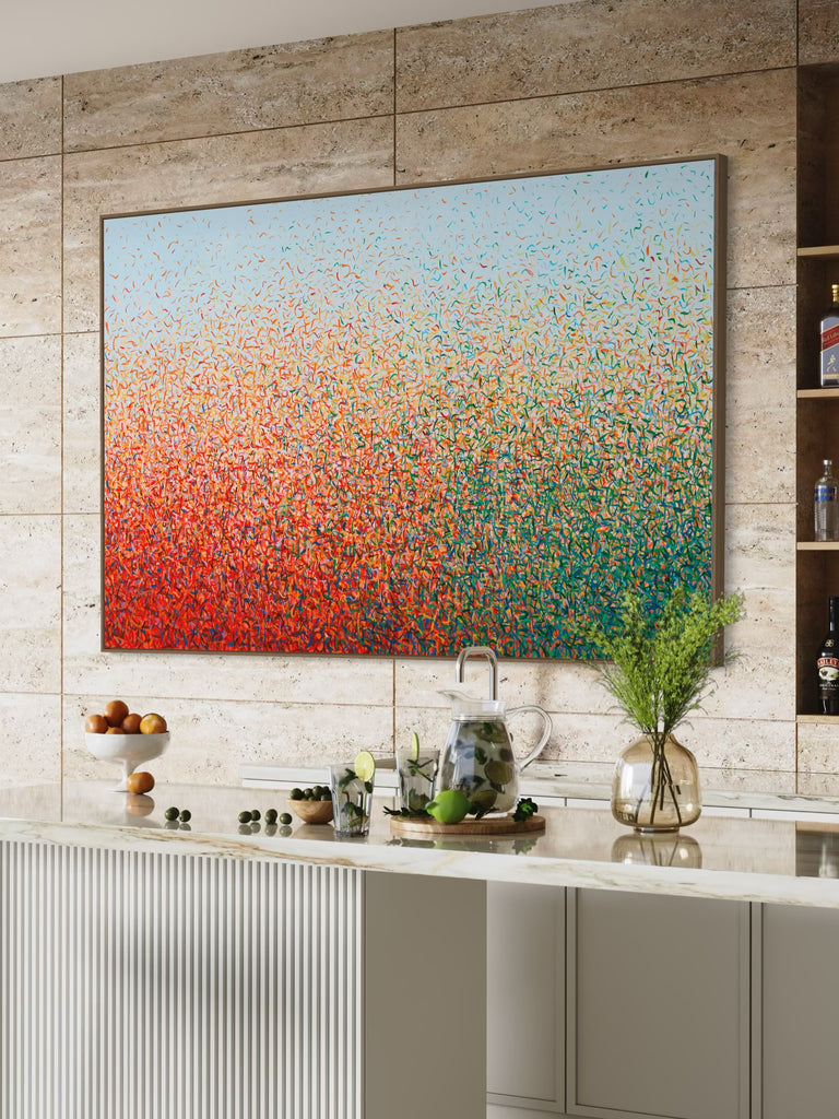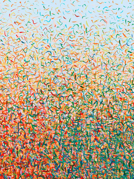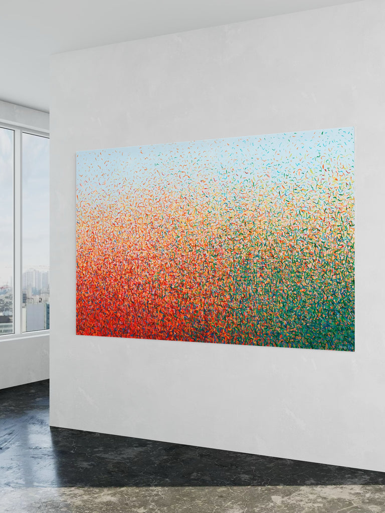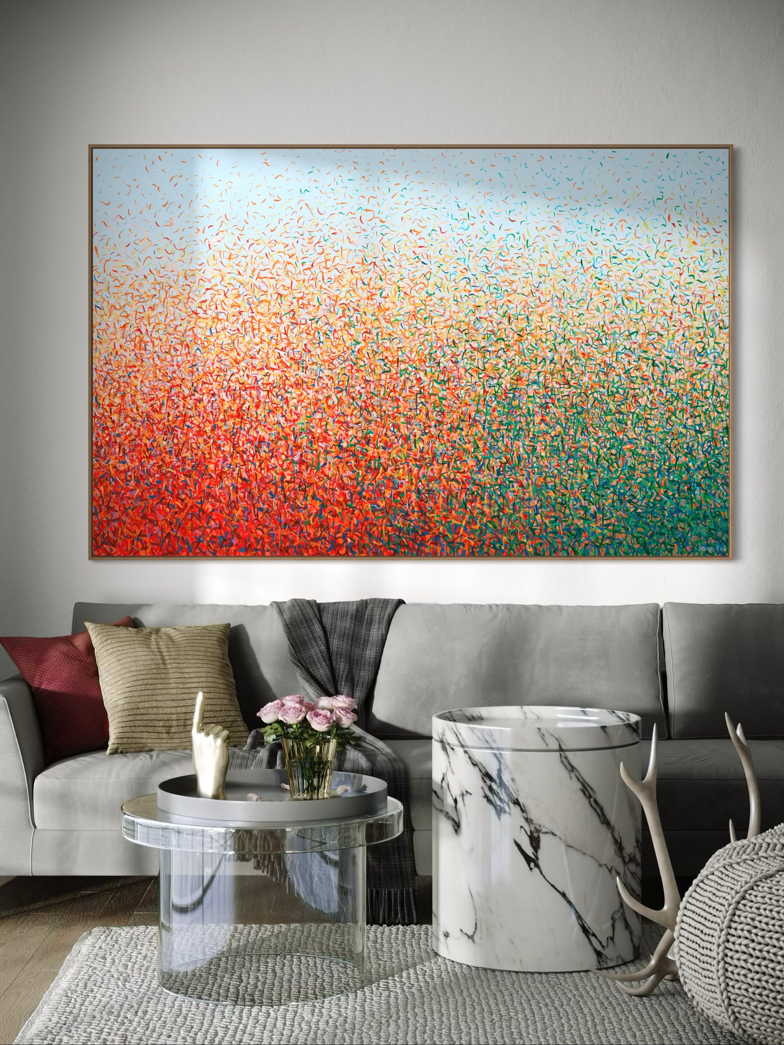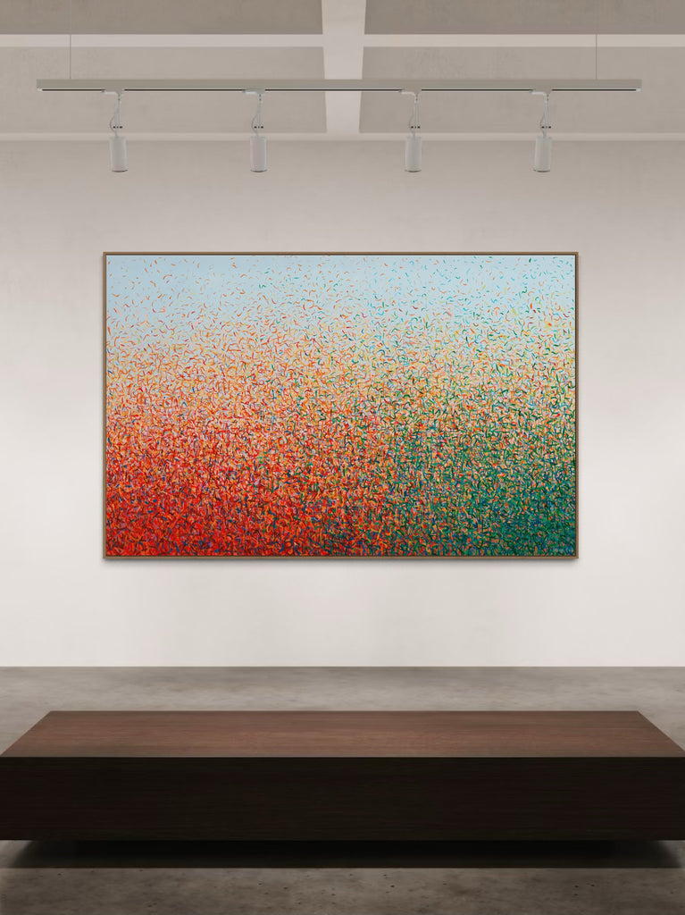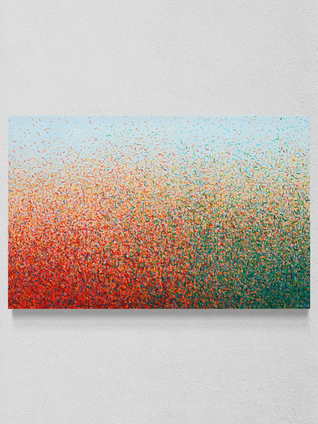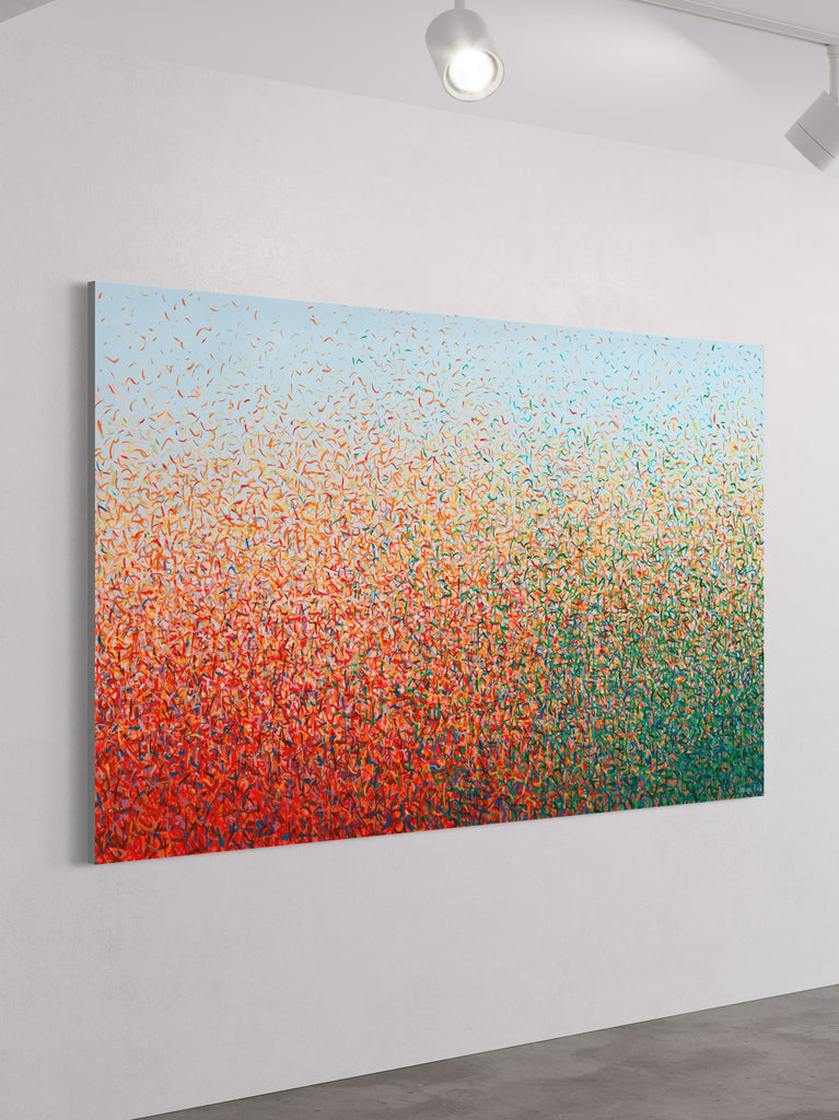 'Australia's Rhythm' is a very detailed painting with colour crossing over one another to create effect. A painting to express how nature is free to do whatever it wants, without expectations. This work is specific to the colours of Uluru in the Northern Territory and how they intertwine creating a dance of their own. It is not intended to be too literal and so allows you to see whatever you can find.