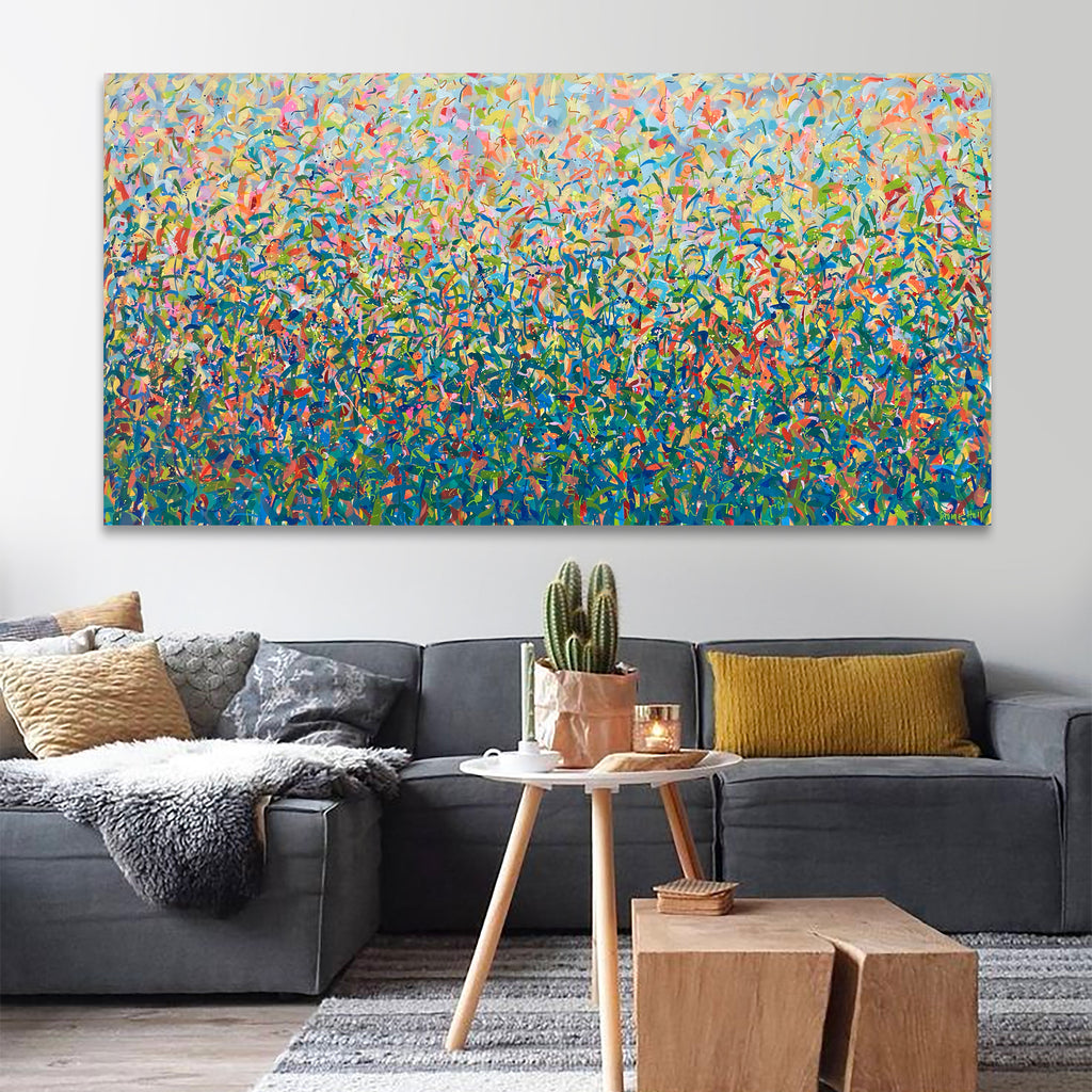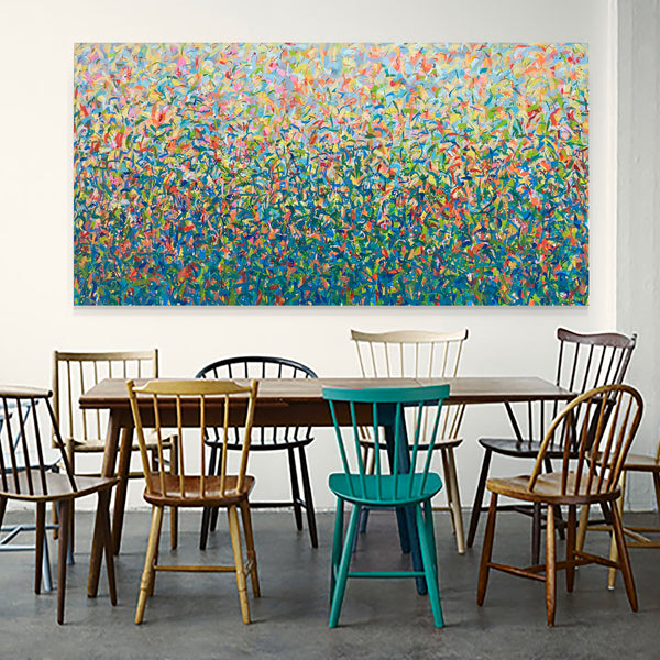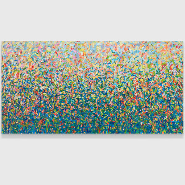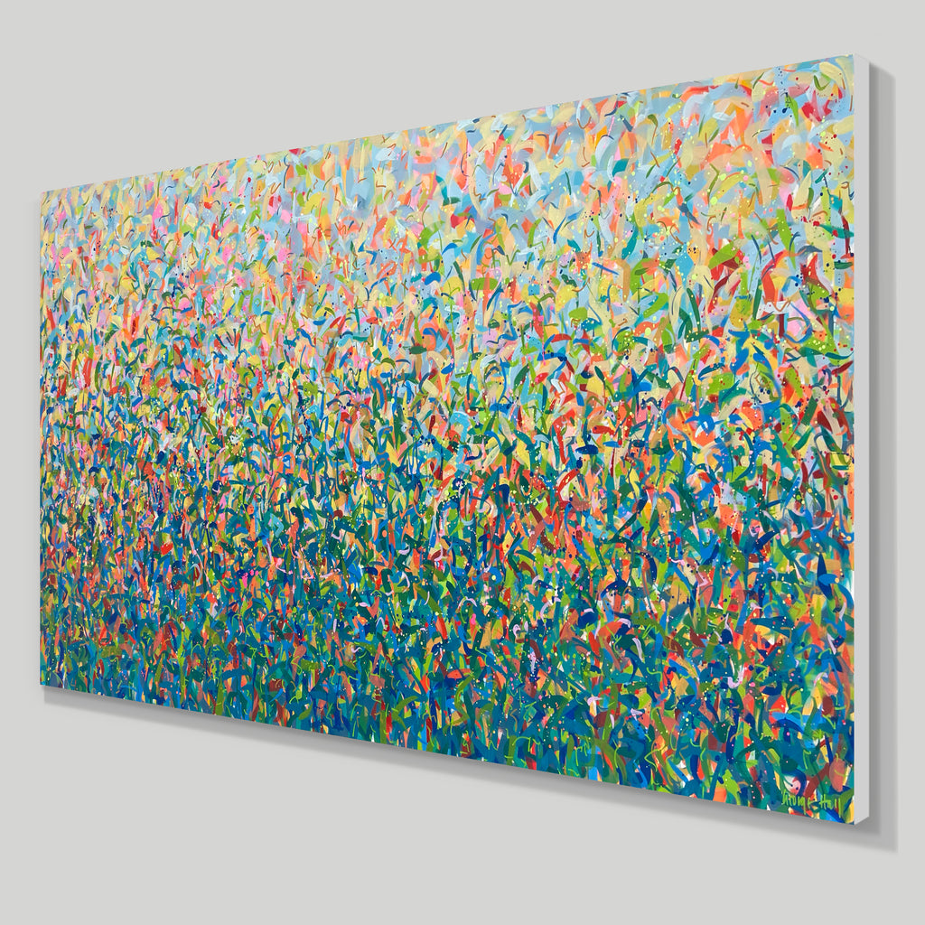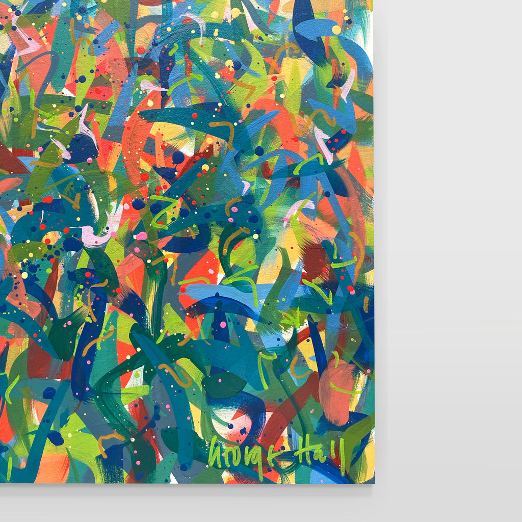 'Bronte Garden Dance' is a painting that was inspired by a garden in Bronte, located in Sydney, Australia. This is a very detailed painting with colour crossing over one another to create effect. A painting to express how nature is free to do whatever it wants, without expectations. This work is specific to the colours of Bronte and how they intertwine creating a dance of their own. It is not intended to be too literal and so allows you to see whatever you can find.