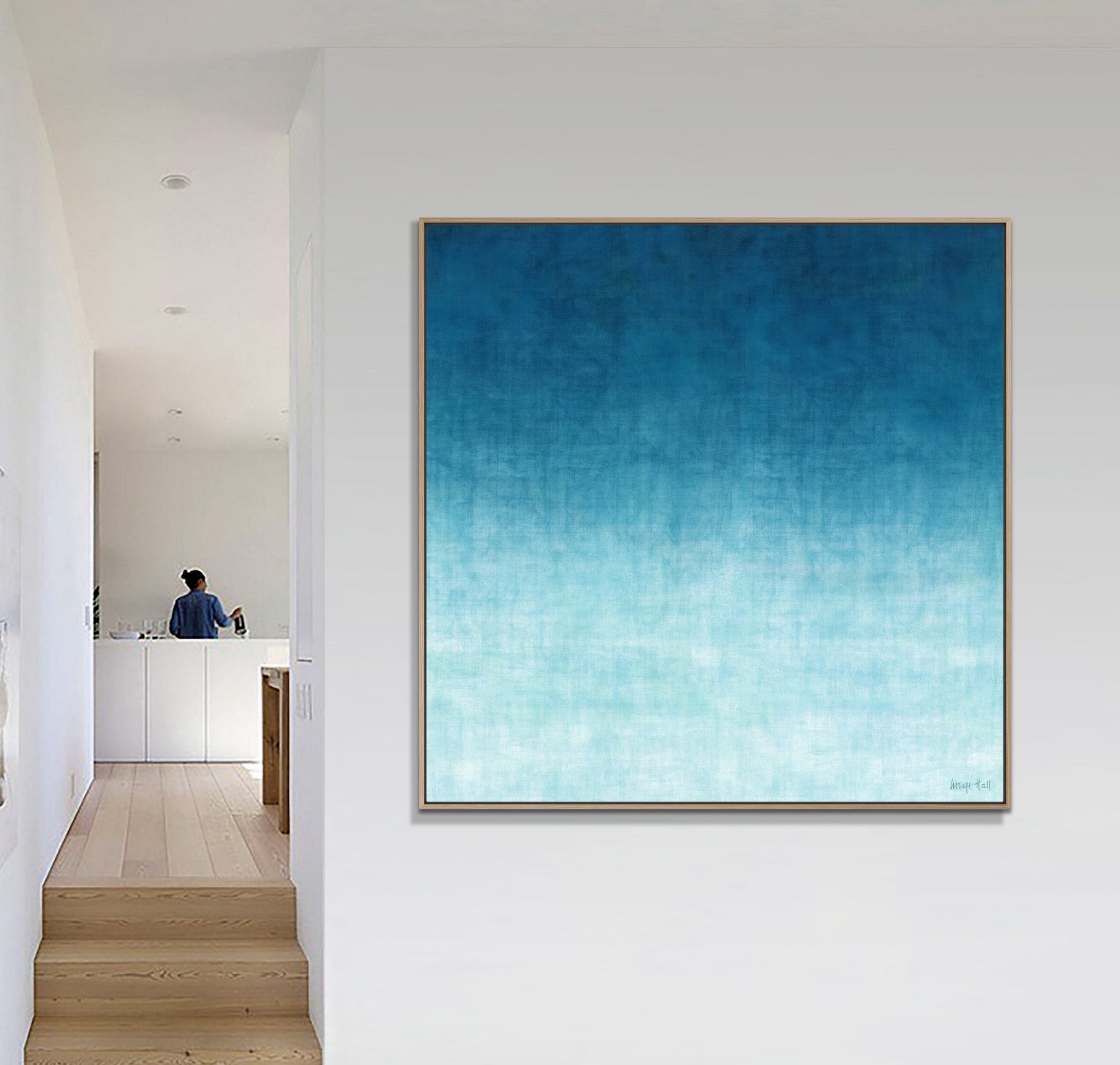 Gradual Ocean is a mixed media artwork created with spray paint, acrylic relief printing with textured fabric, polymer stained glazes and finished with 3 coats of UV protective satin varnish, it will not fade in direct sunlight.