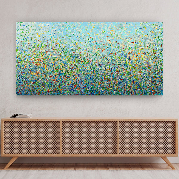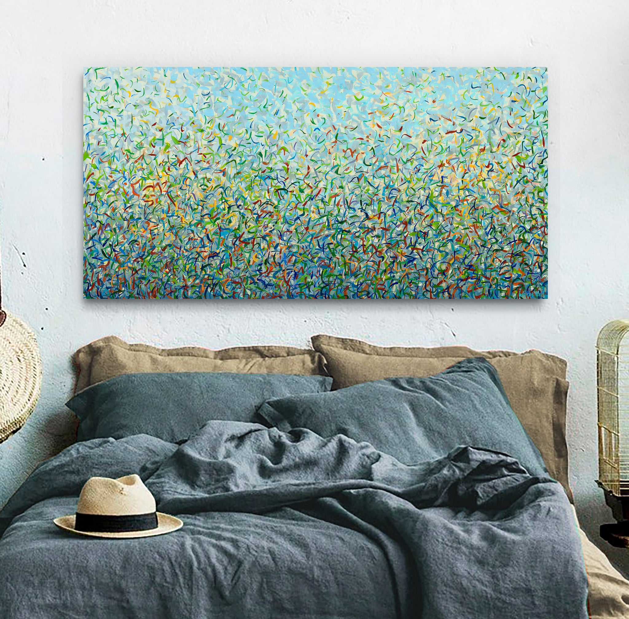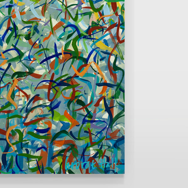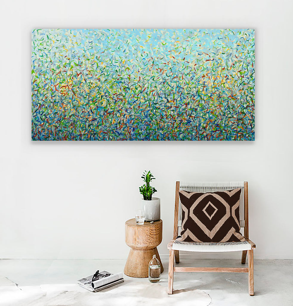 'Dawn Garden Dance' is a very detailed painting with colour crossing over one another to create effect. A painting to express how nature is free to do whatever it wants, without expectations. This work is specific to the colours of an Australian garden at dawn and how they intertwine creating a dance of their own. It is not intended to be too literal and so allows you to see whatever you can find.