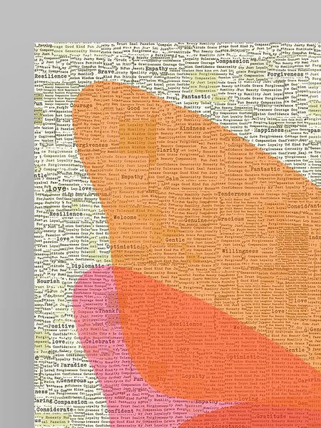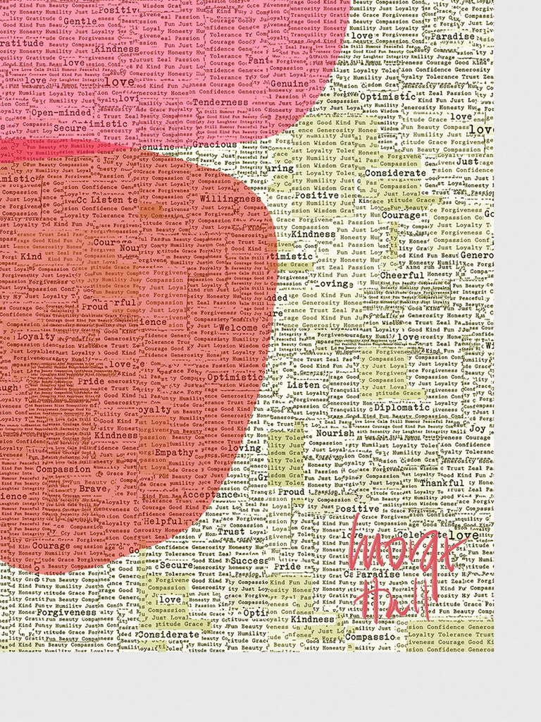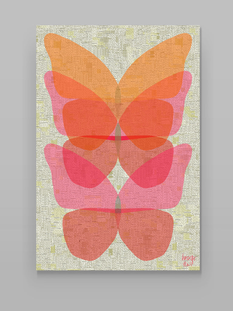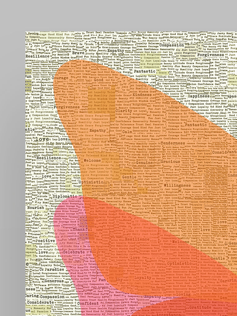 The background is a newspaper effect, constructed using positive and motivational words only. The positive words are a counter play to all the negativity surrounding what the world is going through. I also have a rule that only positive art goes on my wall. I wanted to create a sense of flight and movement, a feeling of growing and moving forward.