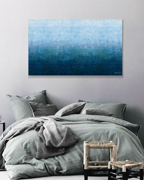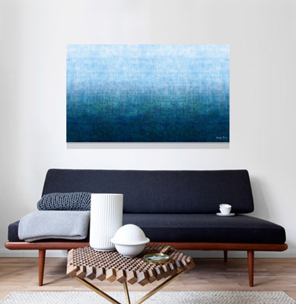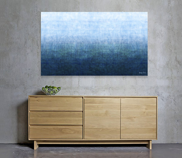 'Gradual Deep Sea' is a mixed media artwork created with spray paint, acrylic relief printing with textured fabric, polymer stained glazes and finished with 3 coats of UV protective satin varnish, it will not fade in direct sunlight.