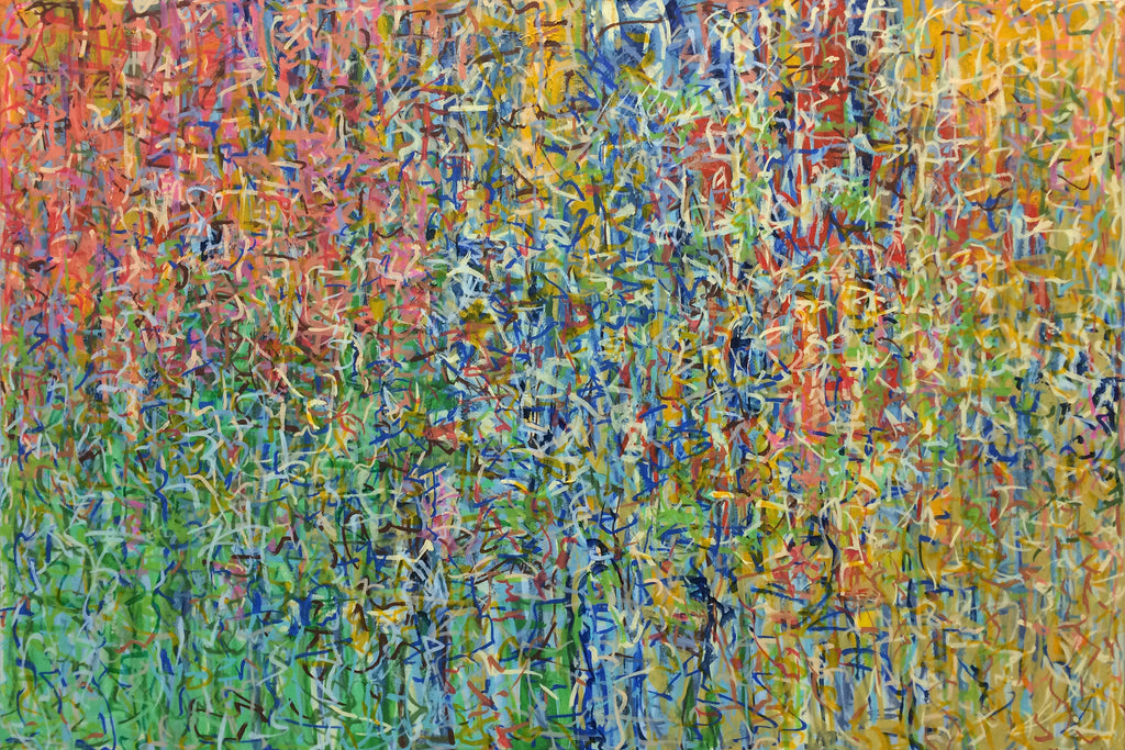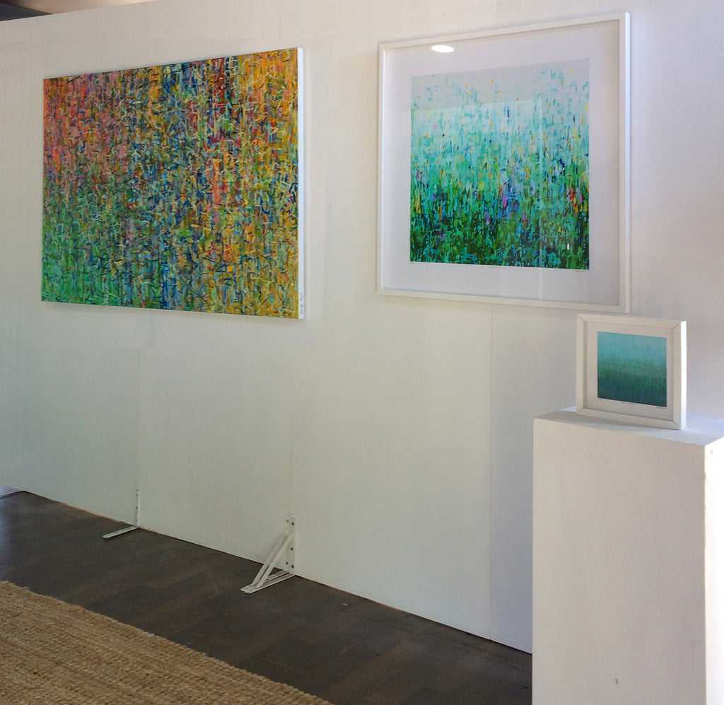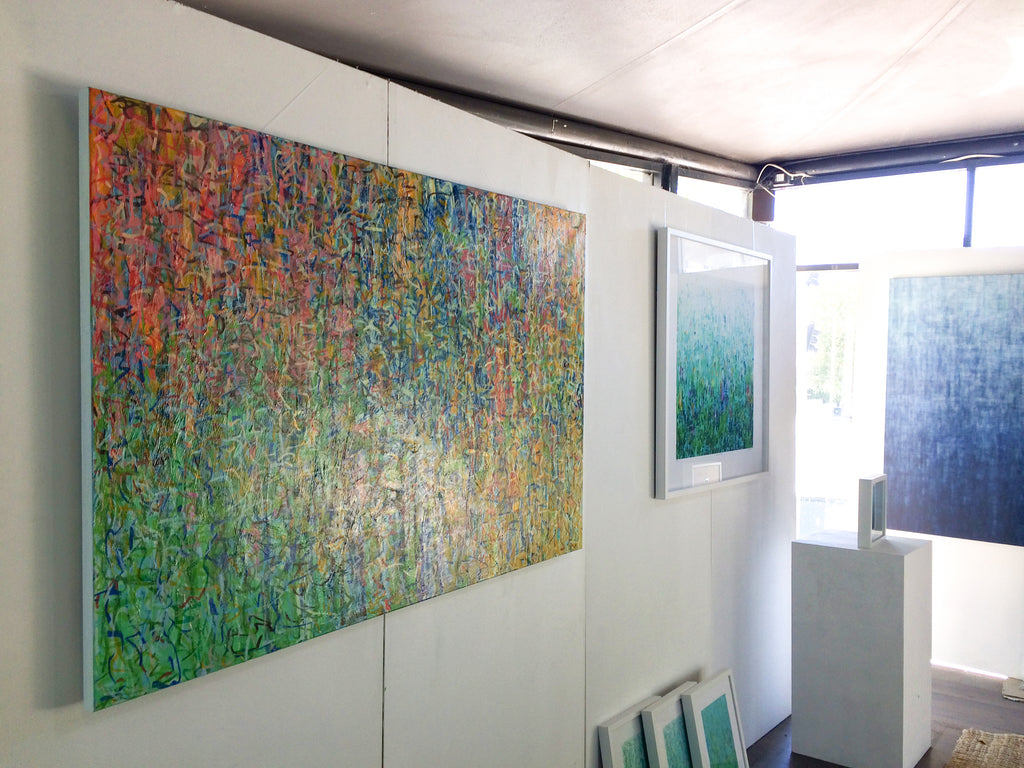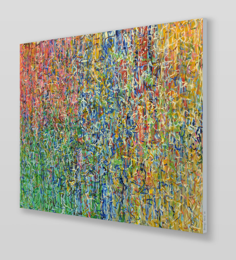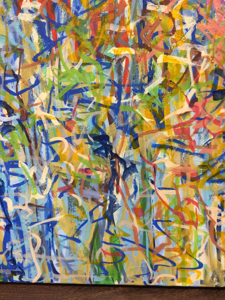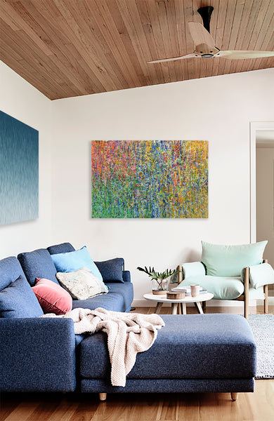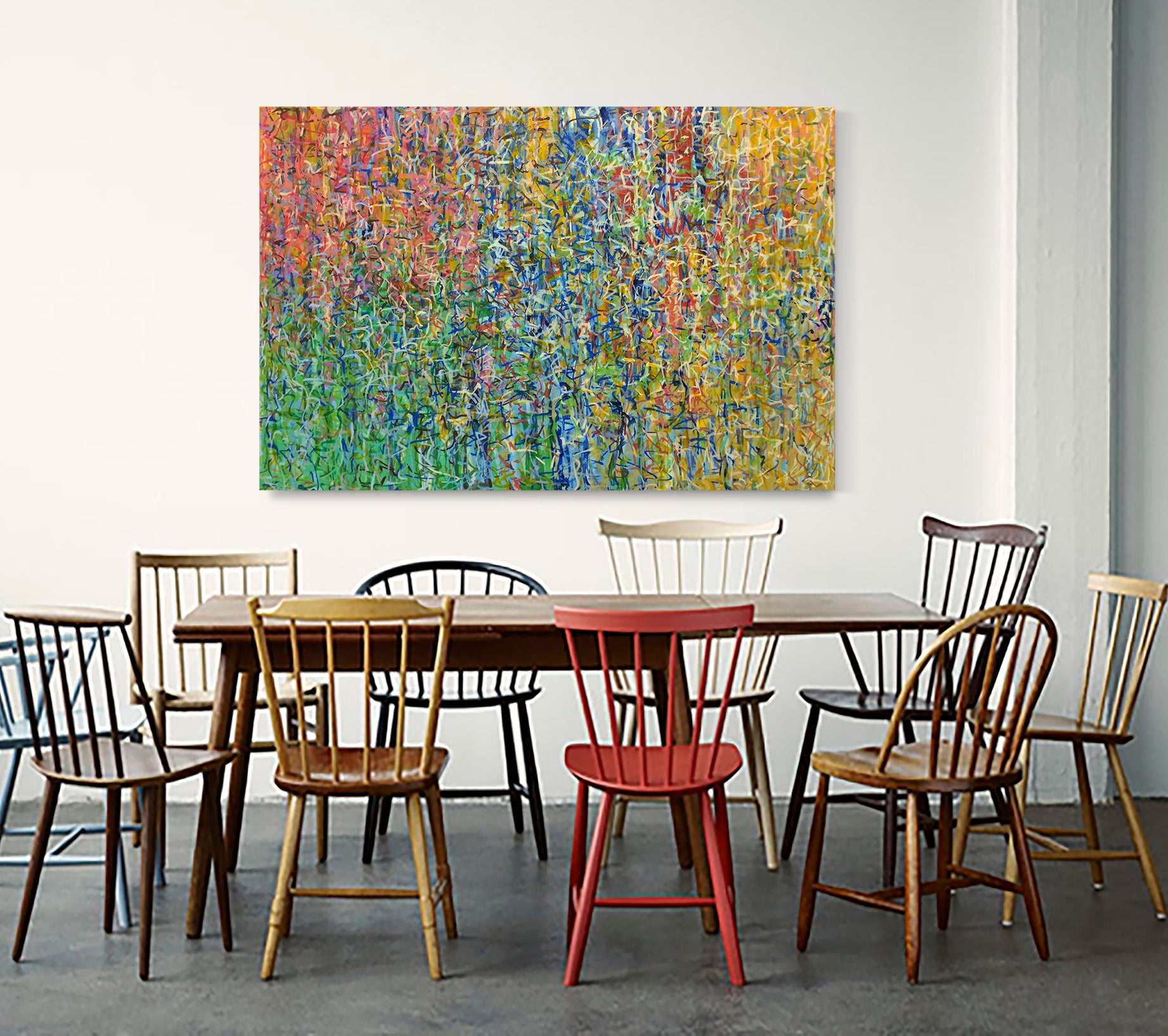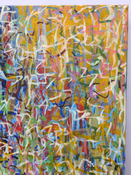 'Happy Hippies' is a large painting and took months to complete. This work is very detailed with colour crossing over one another to create effect. This is a painting I have wanted to paint for years, it is completely free and without expectations. It's the painting every artist needs to paint, the one which someone might say 'My 3 year old could paint better than that'. It is not intended to be too literal and so allows you to see whatever you can find.... hence the name 'Happy Hippies'