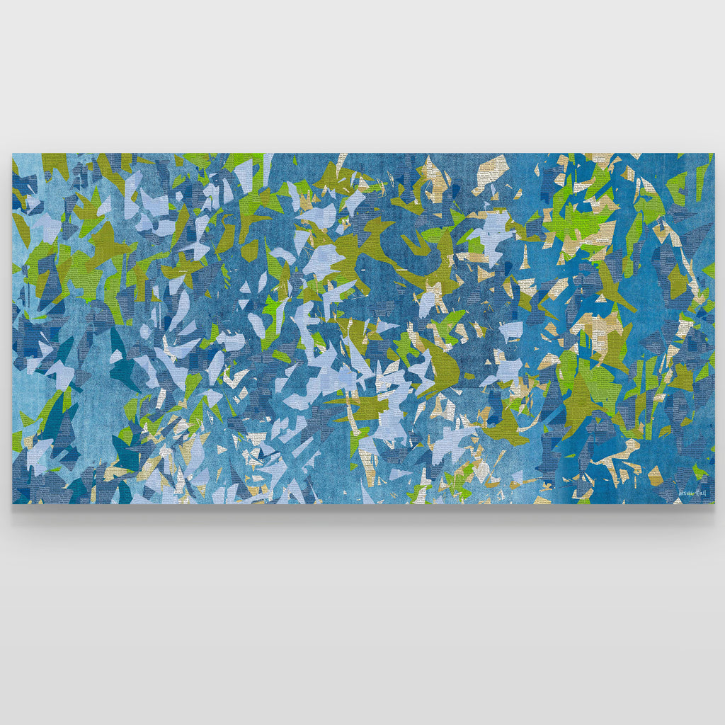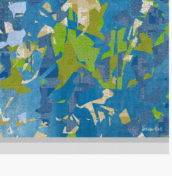 'Marine News', some days I just want to create a big colourful artwork. All the newsprint are made up of positive words, please look at the detailed photos to see this. I wanted to create the feeling of flight and movement to spread positivity and joy rather than what we seem to get in the news.