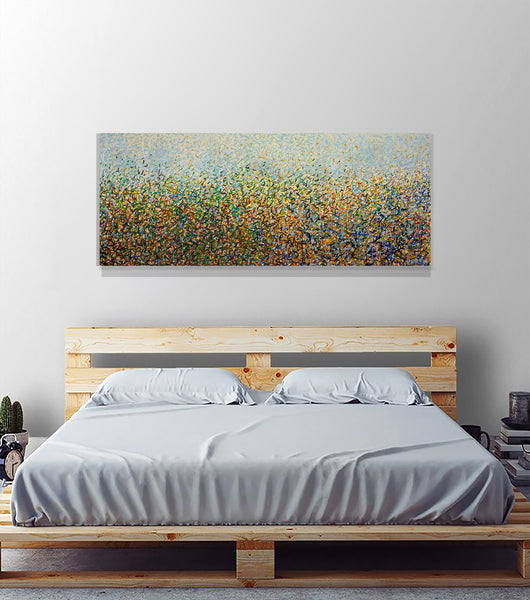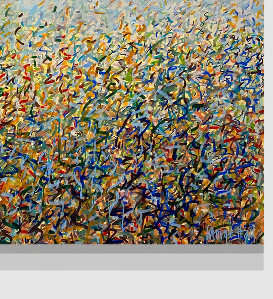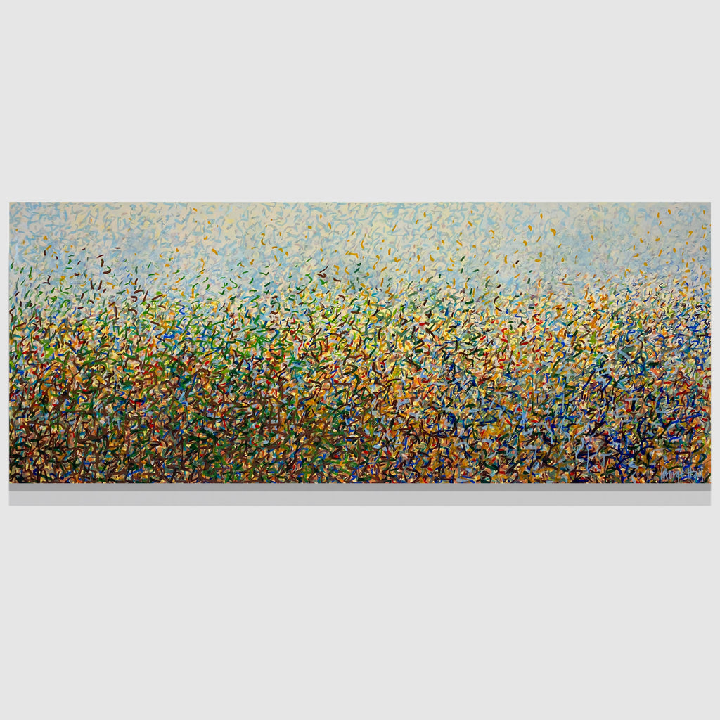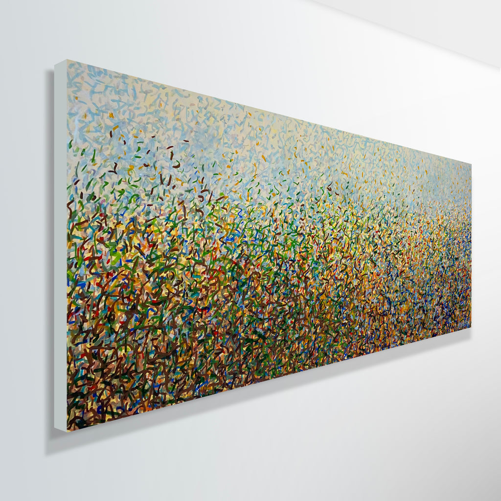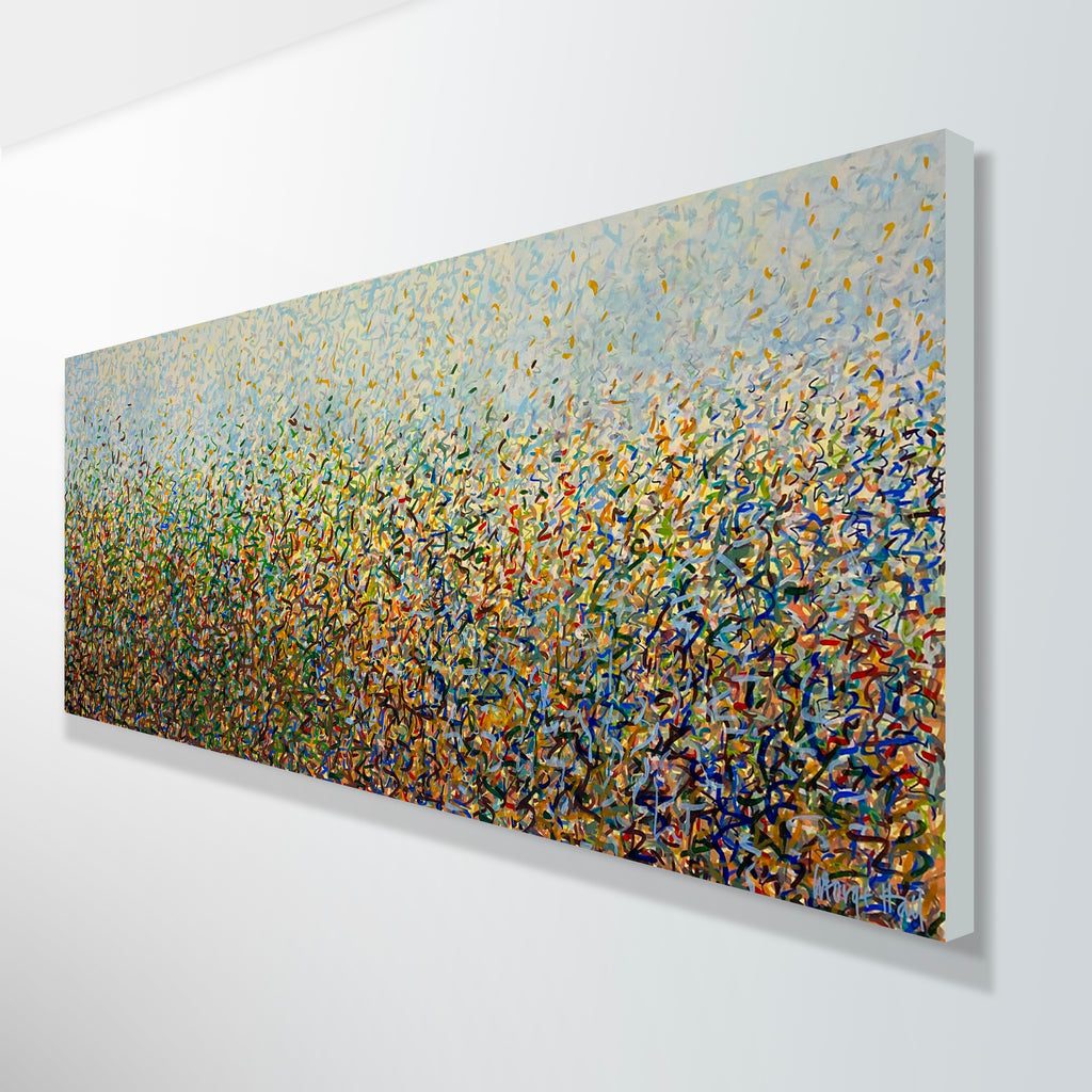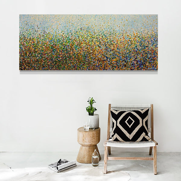 'Nature's Bush Dance' is a very detailed painting with colour crossing over one another to create effect. A painting to express how nature is free to do whatever it wants, without expectations. This work is specific to the colours of Australia and how they intertwine creating a dance of their own. I really liked working with this long narrow canvas, giving me the ability to show a sense of movement. It is not intended to be too literal and so allows you to see whatever you can find.
