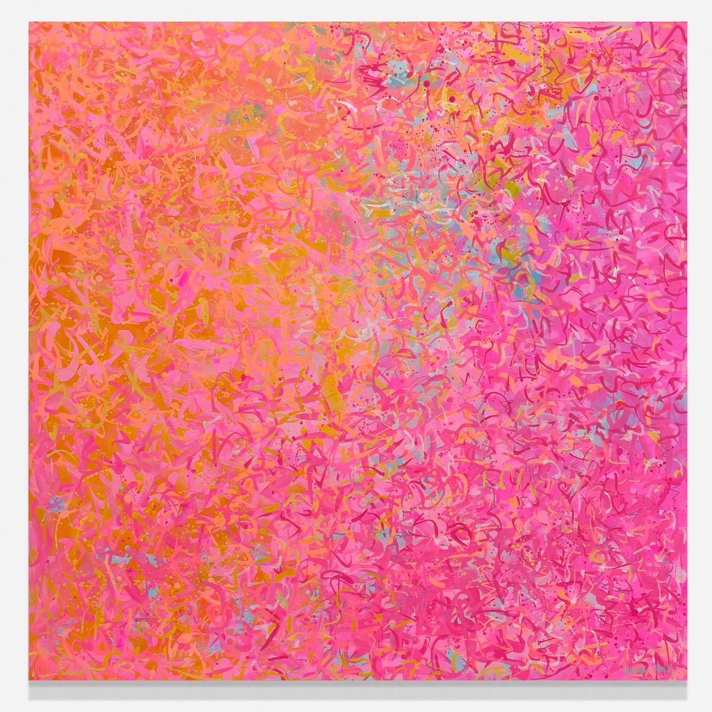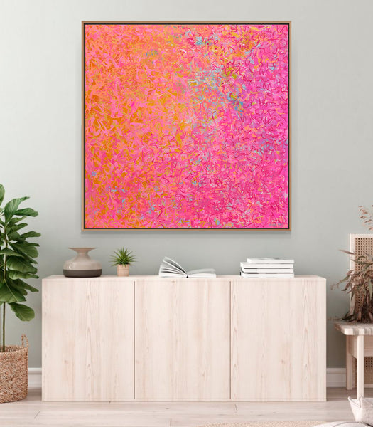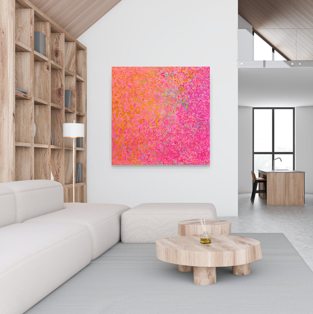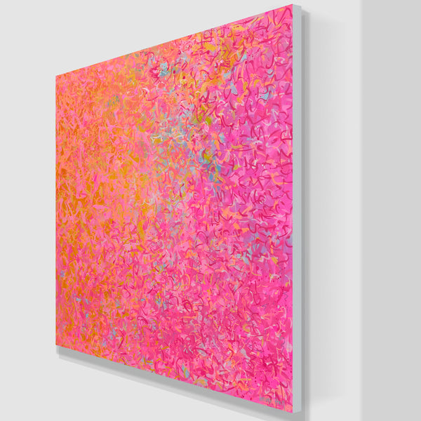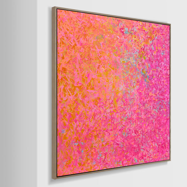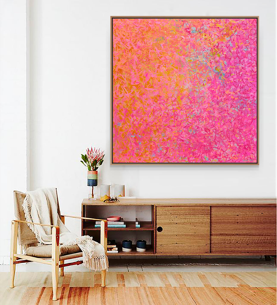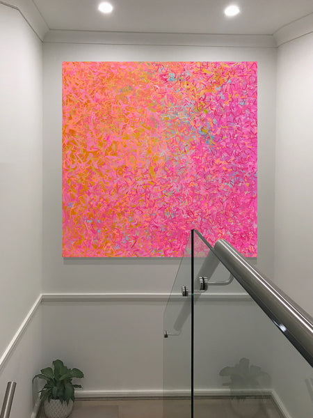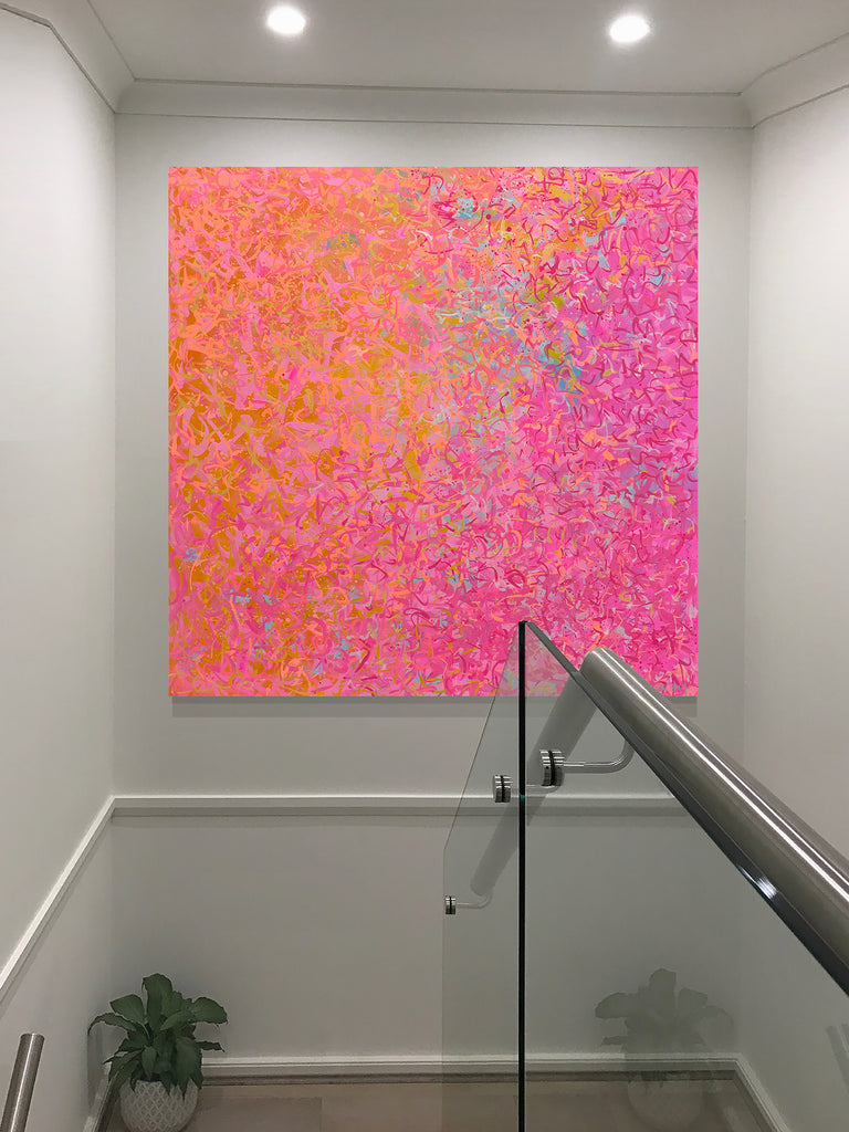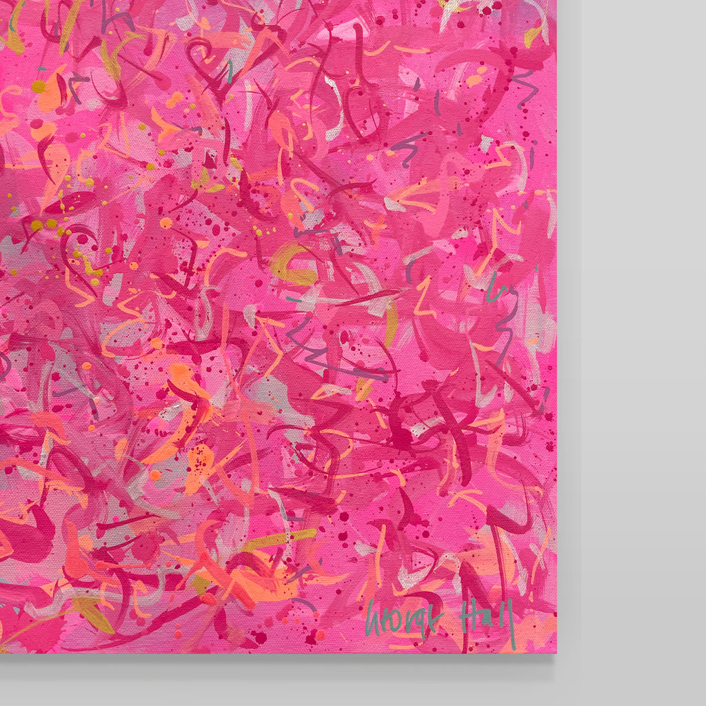 'Neon Garden' is a detailed painting with colour crossing over one another to create effect. This bright-coloured painting has highlights of neon pink and orange. A painting to express how nature is free to do whatever it wants, without expectations. This work shows how these colours intertwine creating a dance of their own. It is not intended to be too literal and so allows you to see whatever you can find.
