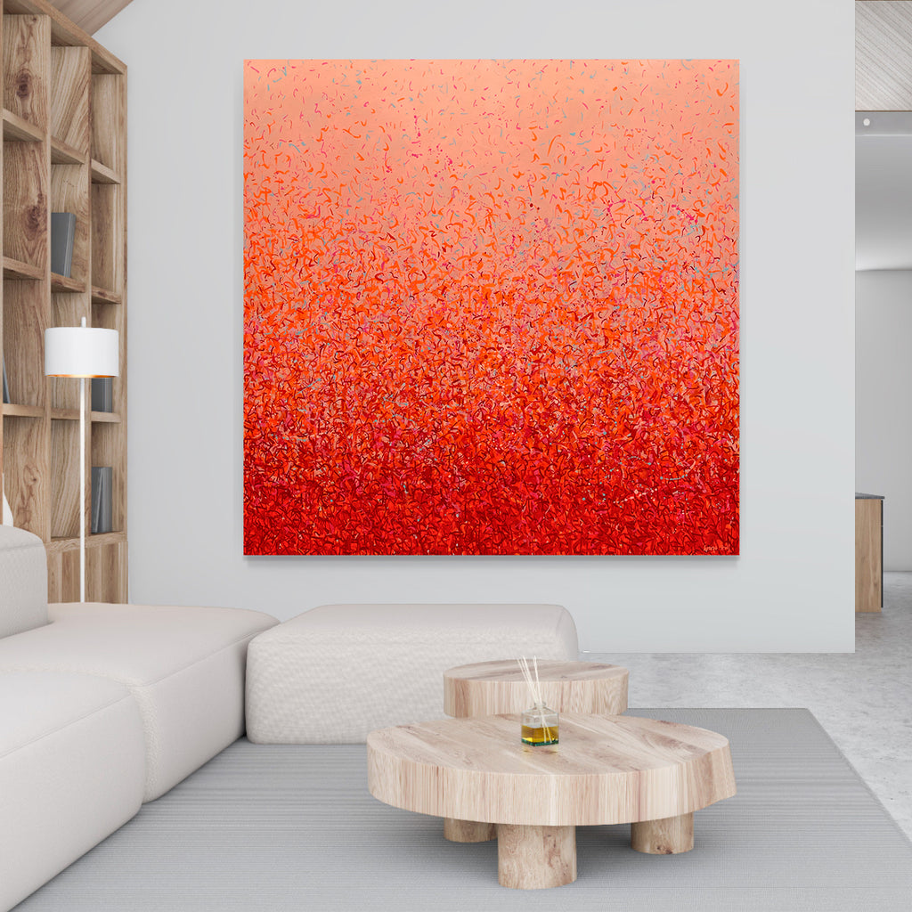 'Neon Garden Two' is a very detailed painting with colour crossing over one another to create effect with neon orange, neon pink and a contract of blue. A painting to express how nature is free to do whatever it wants, without expectations. This work is specific to the colours of the Australian landscape and how they intertwine creating a dance of their own. It is not intended to be too literal and so allows you to see whatever you can find.