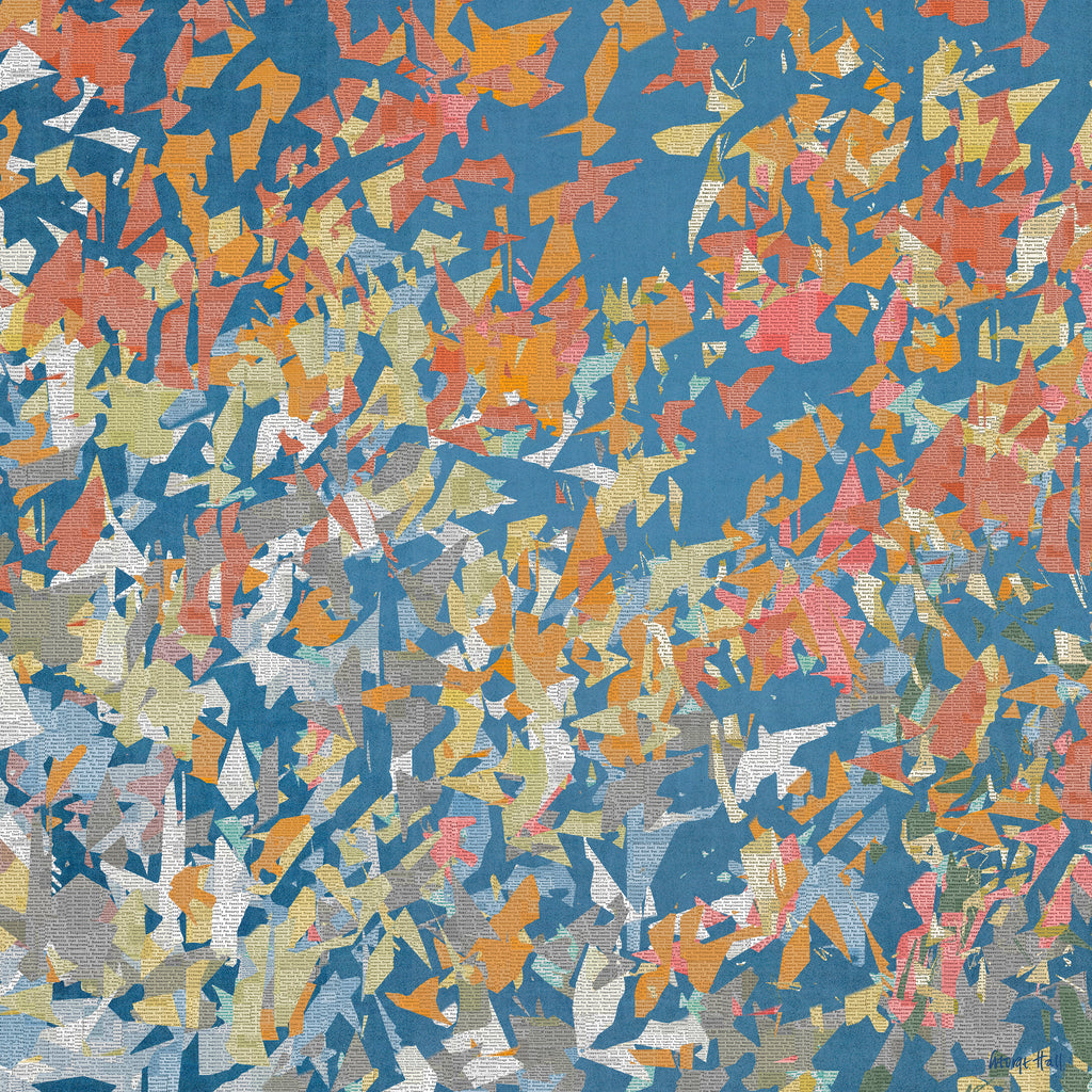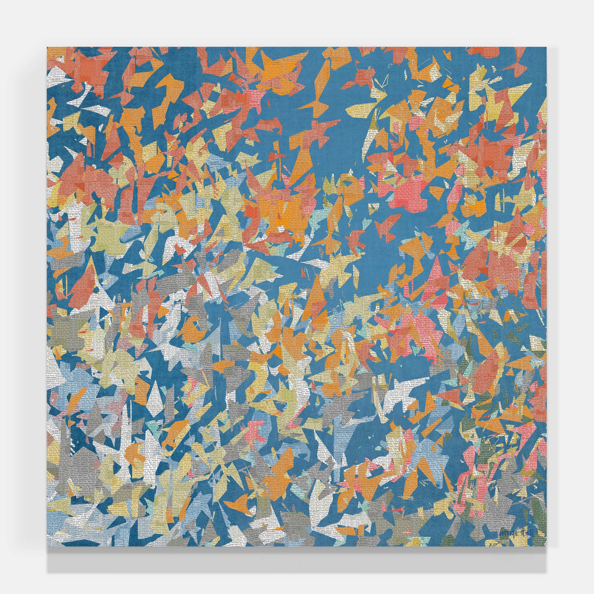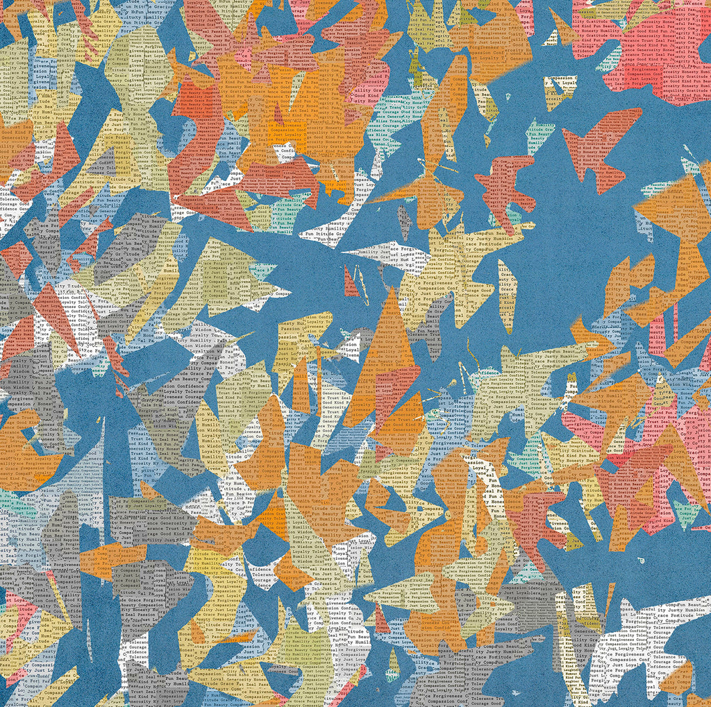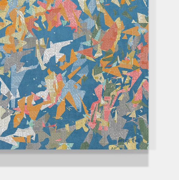 'News Travels Five', some days I just want to create a big colourful artwork. All the newsprint are made up of positive words, please look at the detailed photos to see this. I wanted to create the feeling of flight and movement to spread positivity and joy rather than what we seem to get in the news.