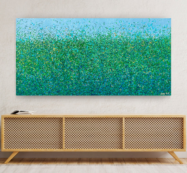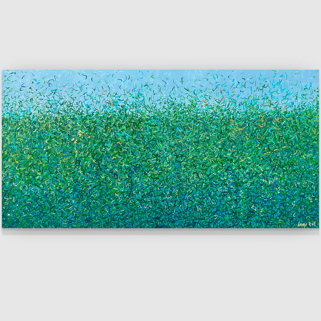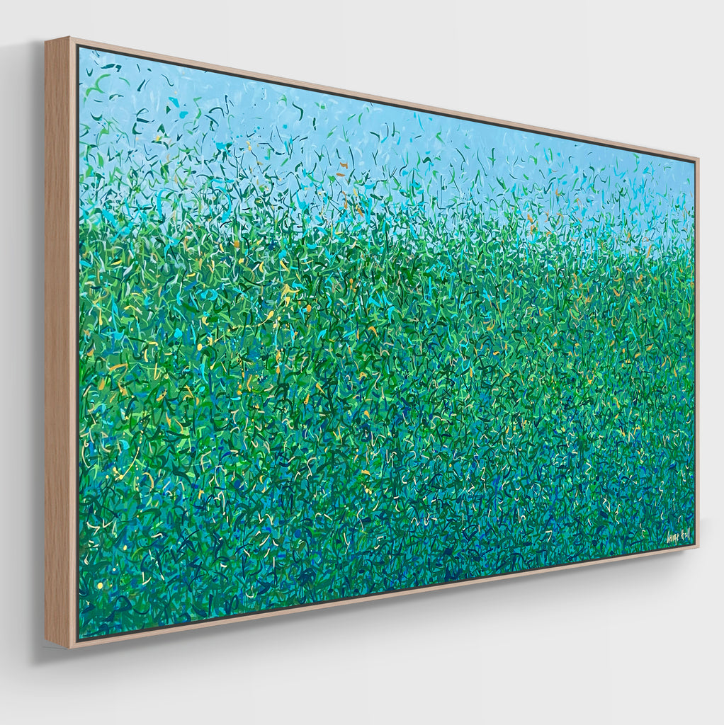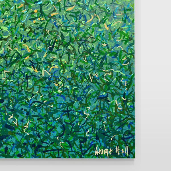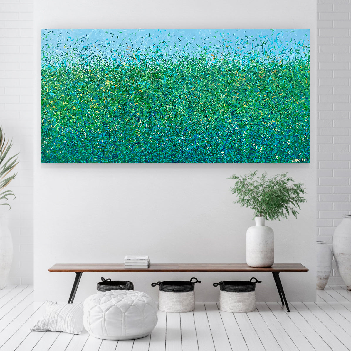 'Noosa Bush Dance' is a very detailed painting with colour crossing over one another to create effect. A painting to express how nature is free to do whatever it wants, without expectations. This work is specific to the colours of the bush in Noosa, Queensland and how they intertwine creating a dance of their own. It is not intended to be too literal and so allows you to see whatever you can find.