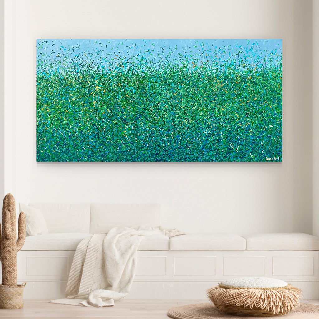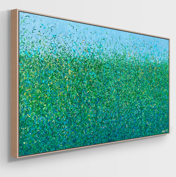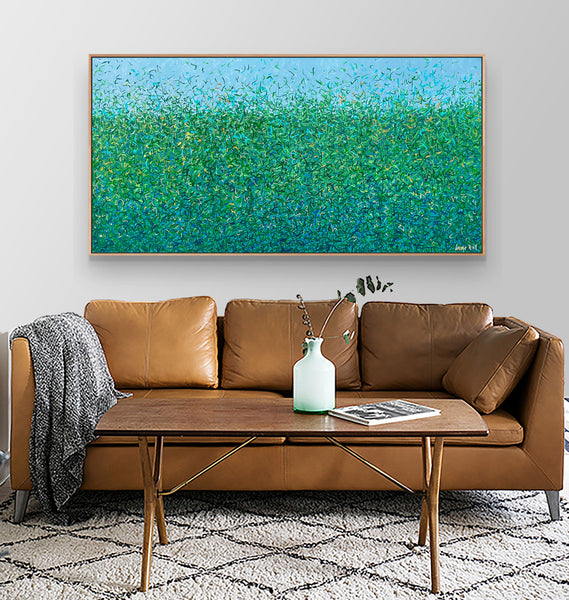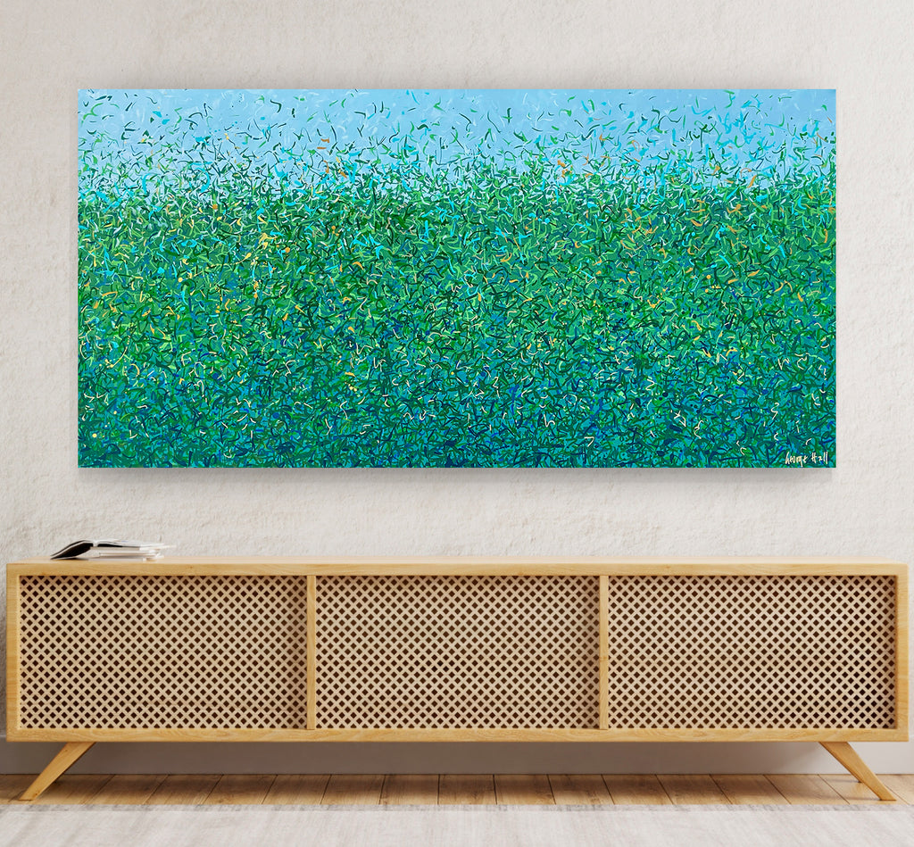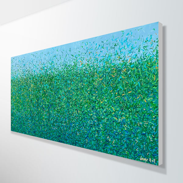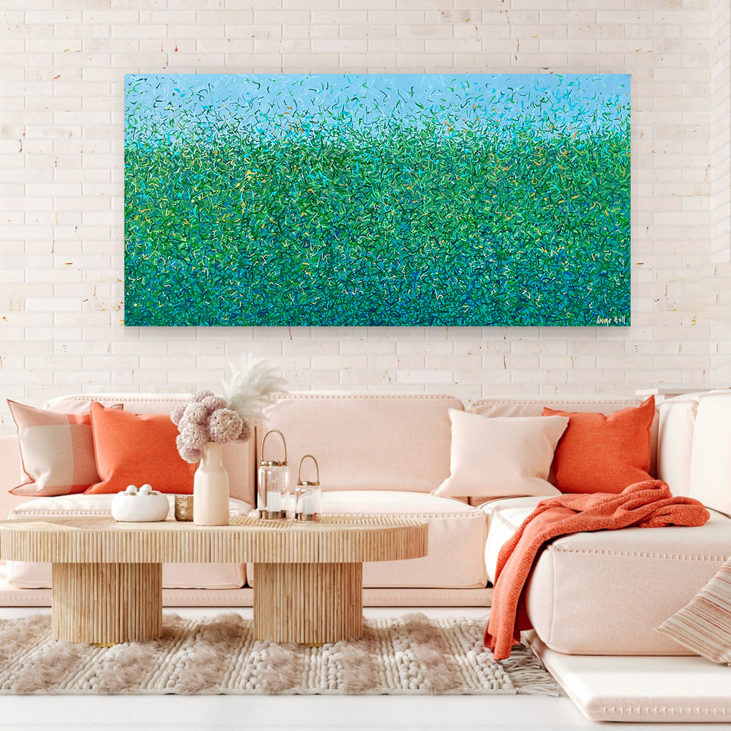 'Noosa Bush Dance' is a very detailed painting with colour crossing over one another to create effect. A painting to express how nature is free to do whatever it wants, without expectations. This work is specific to the colours of the bush in Noosa, Queensland and how they intertwine creating a dance of their own. It is not intended to be too literal and so allows you to see whatever you can find.