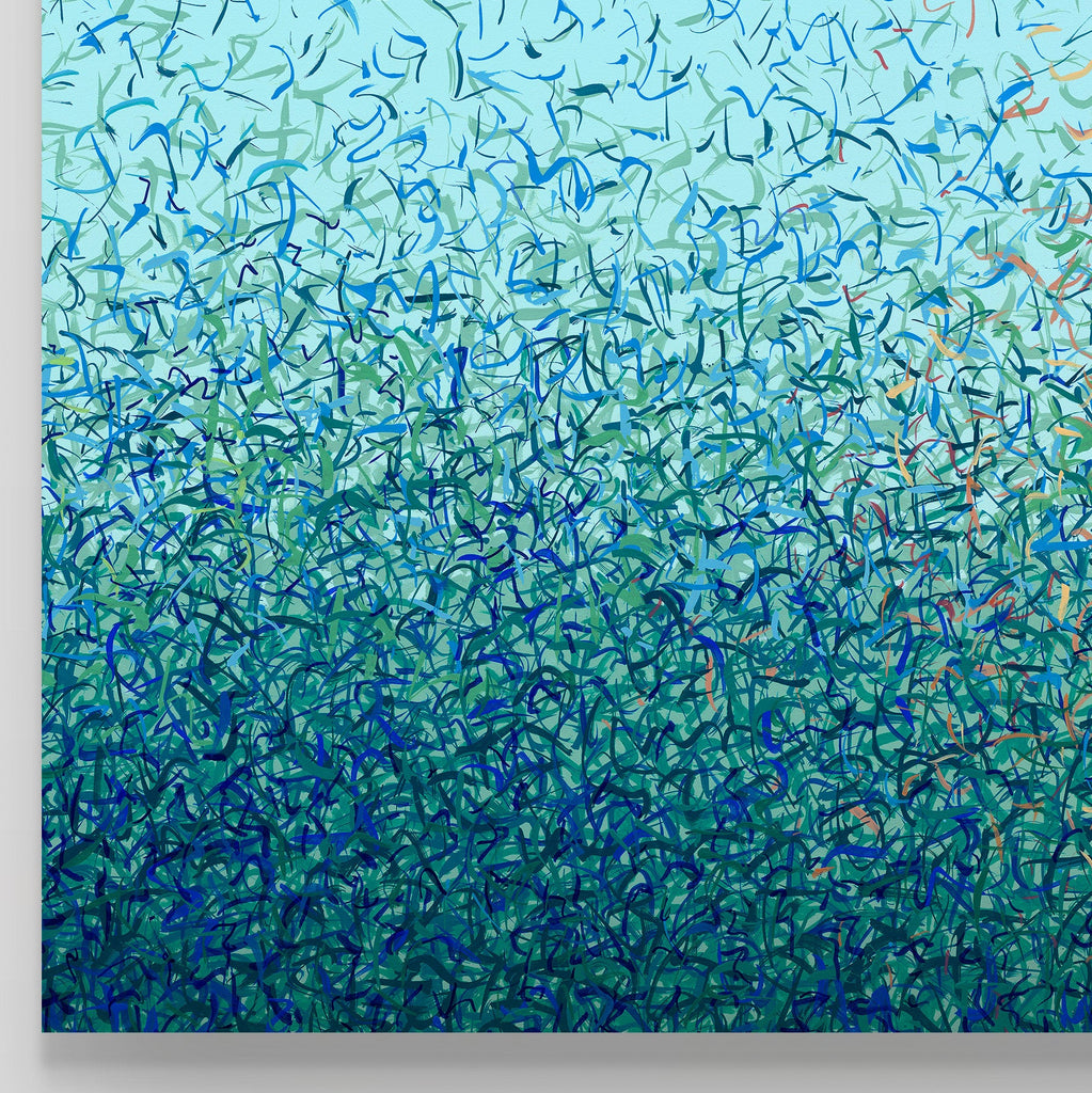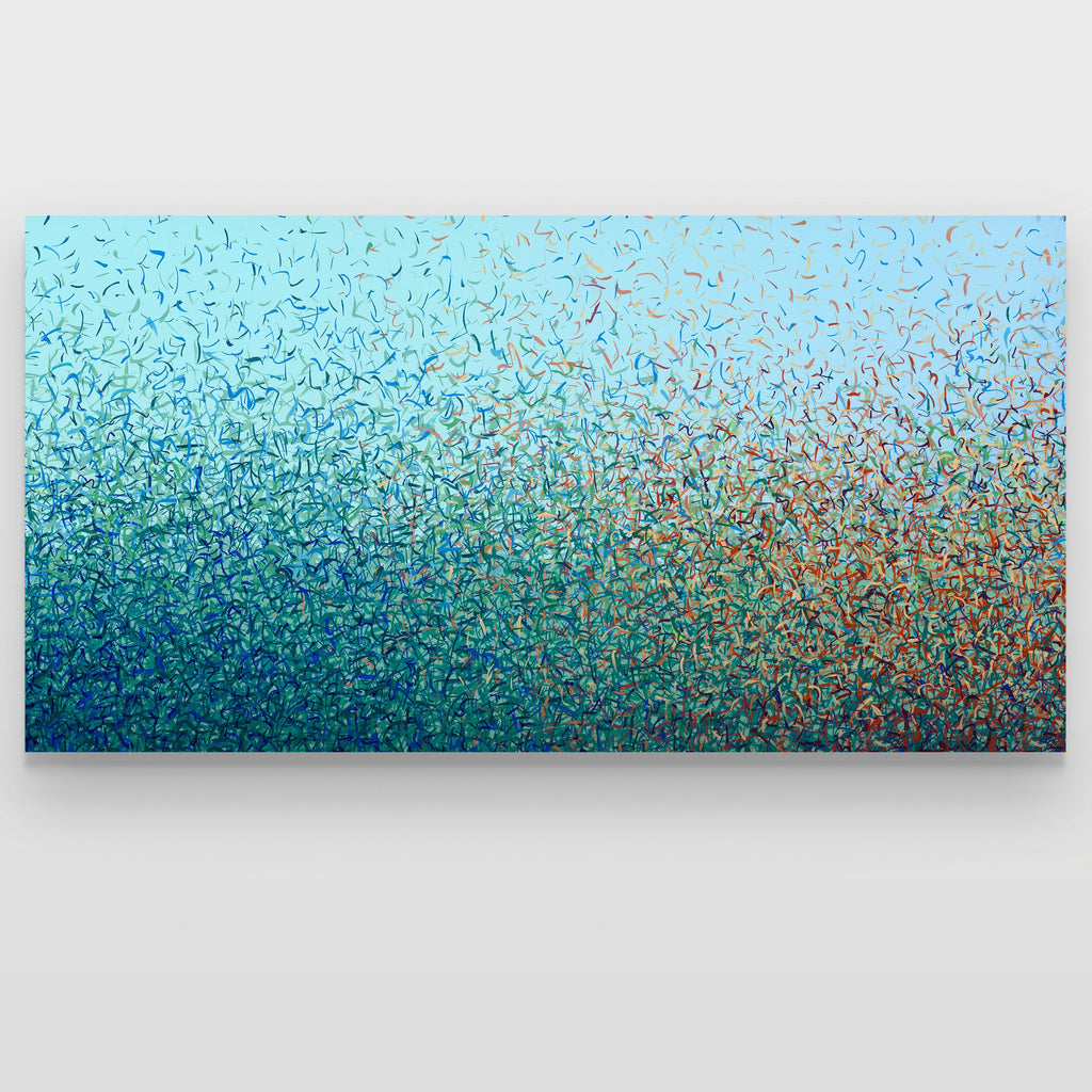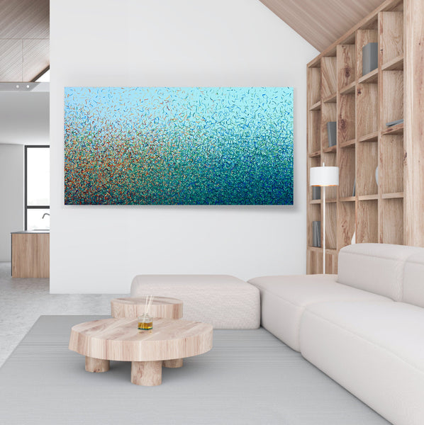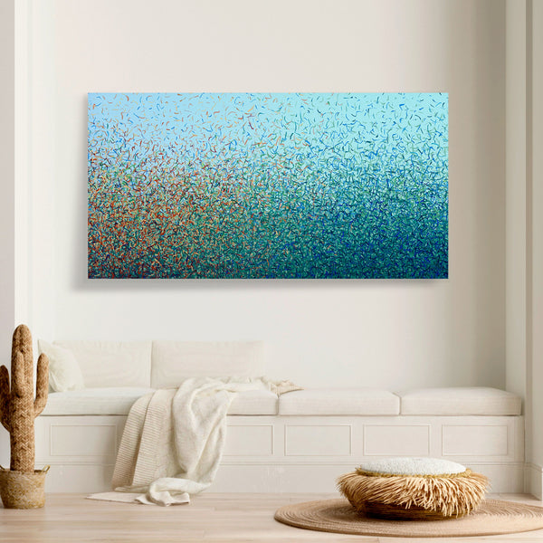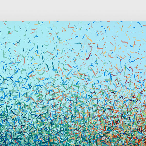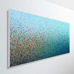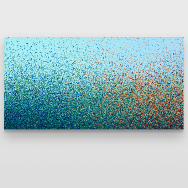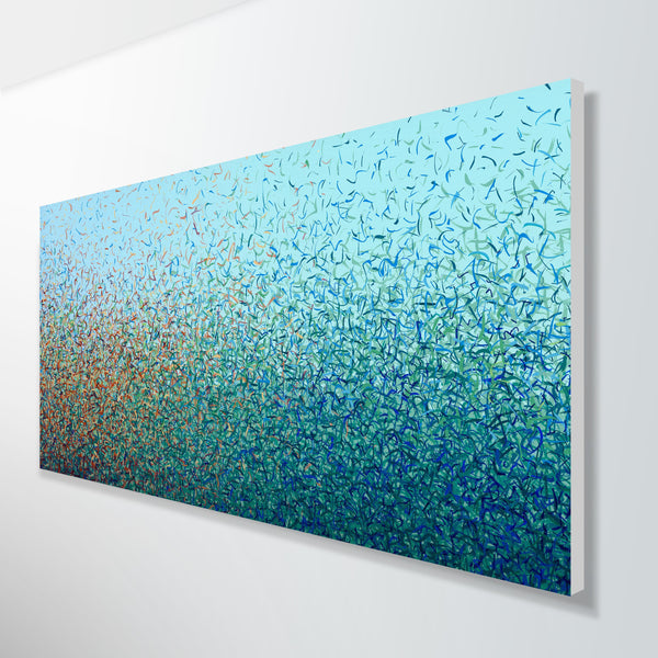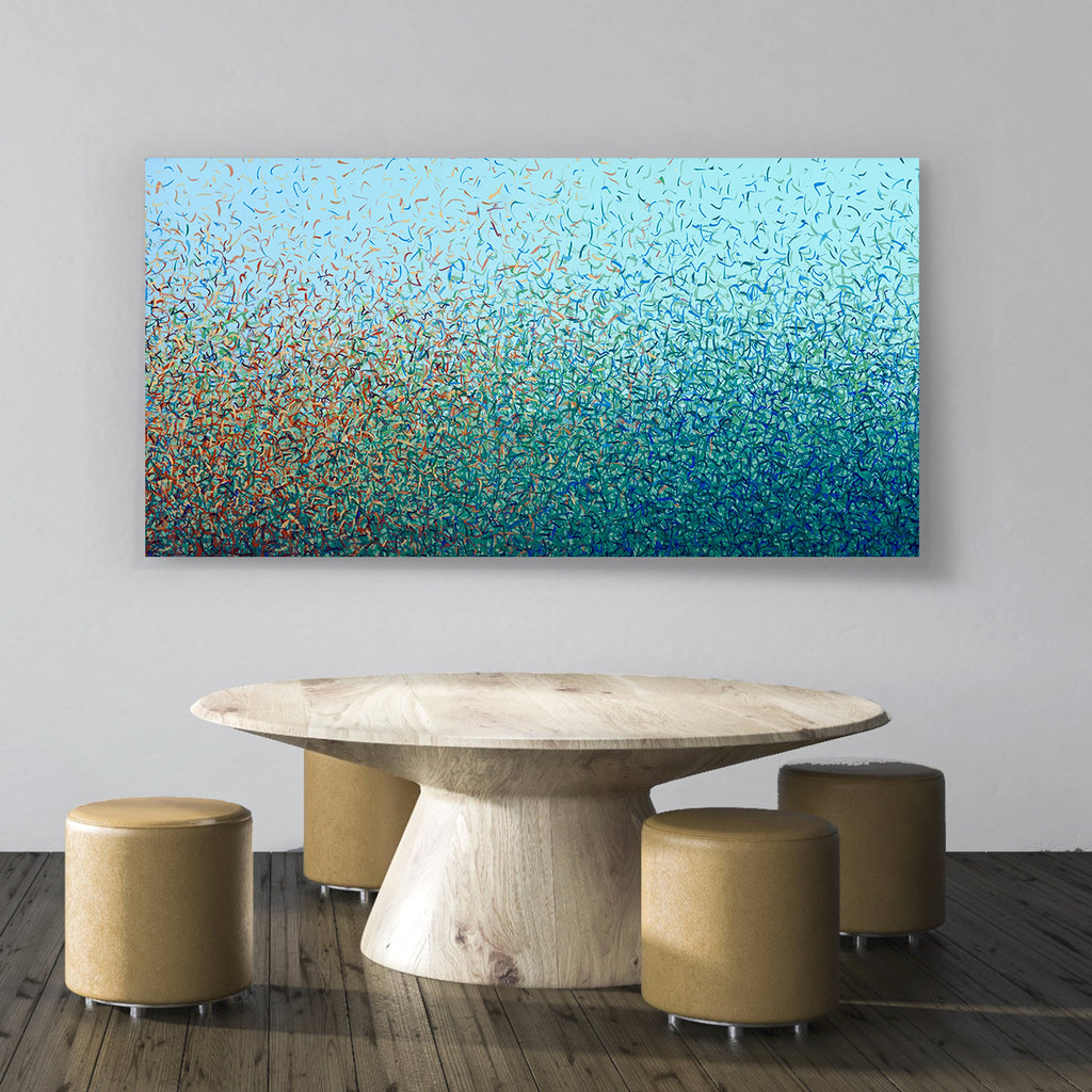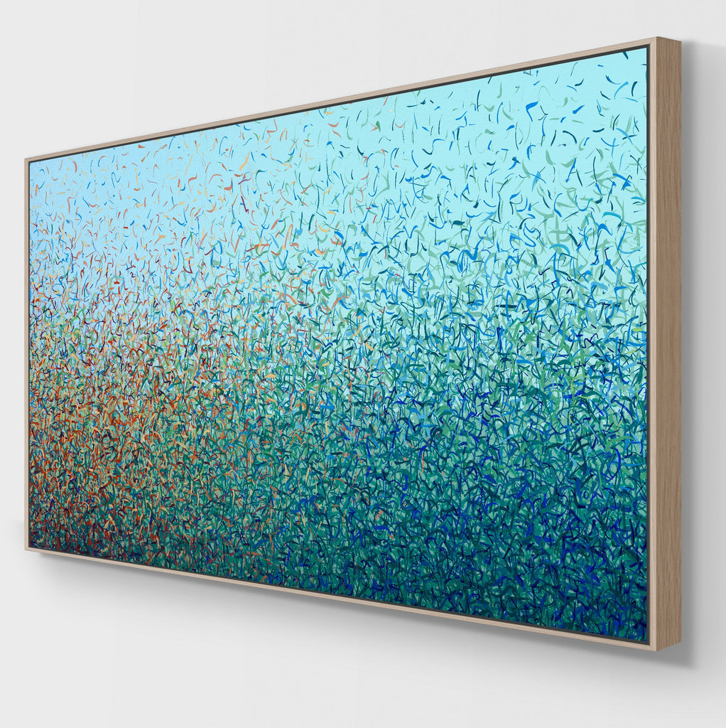 The original artwork is a very detailed painting with colour crossing over one another to create effect. An artwork to express how nature is free to do whatever it wants, without expectations. This work is specific to the colours of the Warruwi beaches in the Northern Territory and how they intertwine creating a dance of their own. It is not intended to be too literal and so allows you to see whatever you can find.