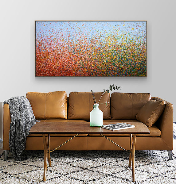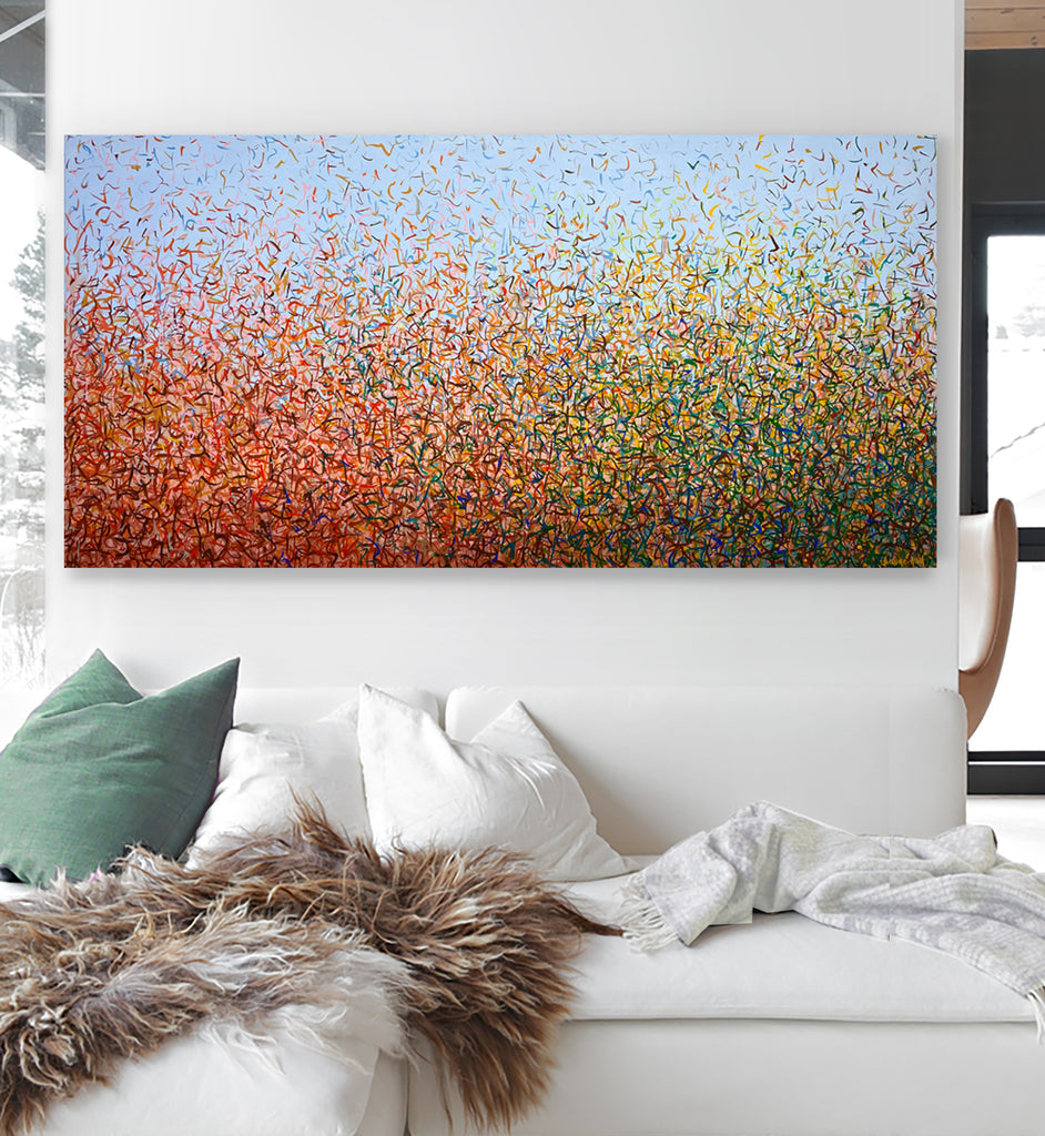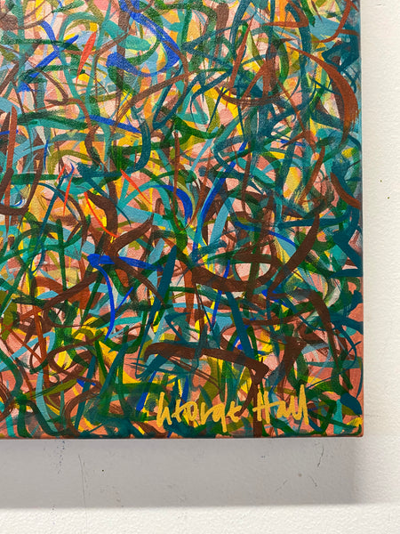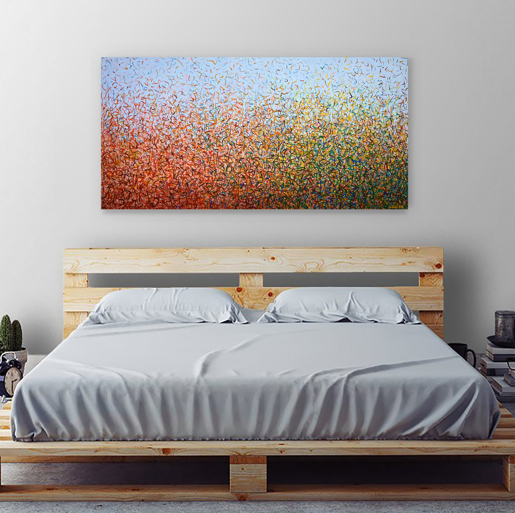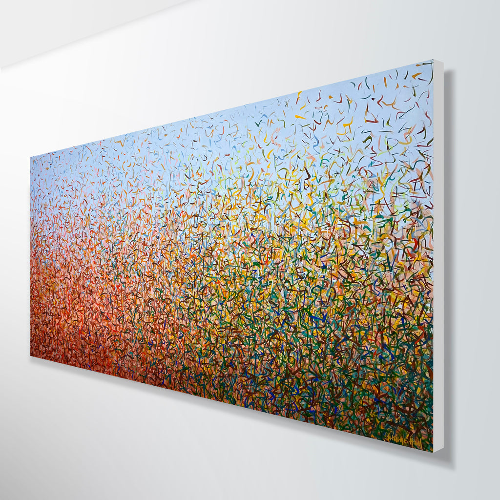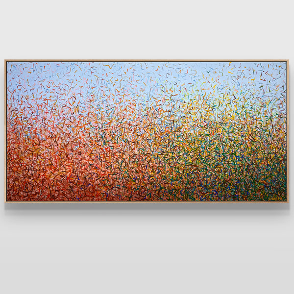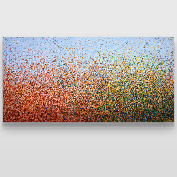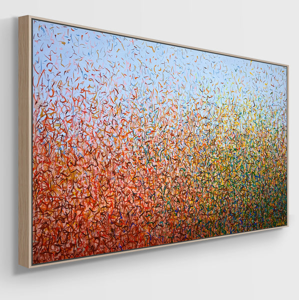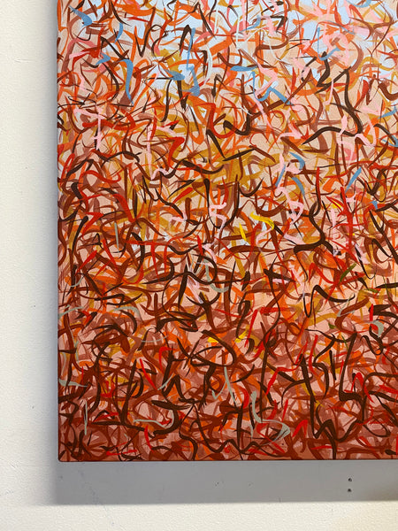 'Oodnadatta' is a detailed painting with colour crossing over one another to create effect. A painting to express how nature is free to do whatever it wants, without expectations. This work shows how these colours intertwine creating a dance of their own. It is not intended to be too literal and so allows you to see whatever you can find.