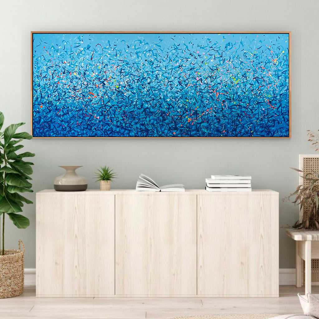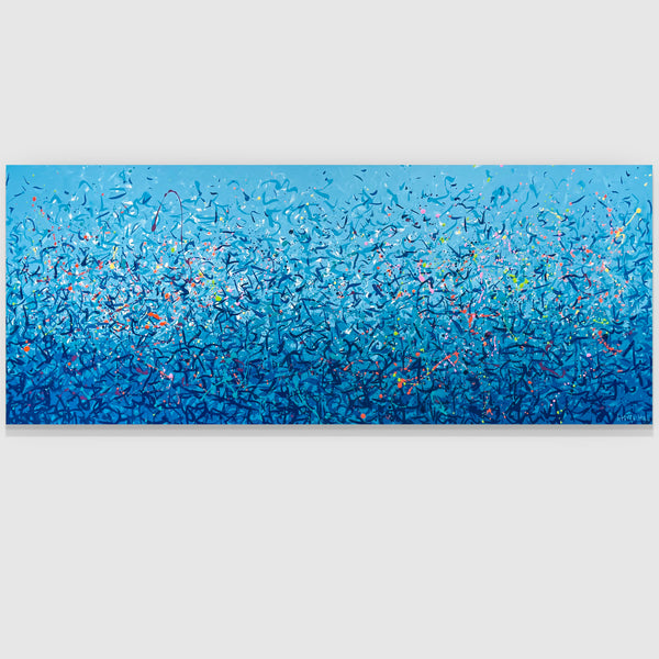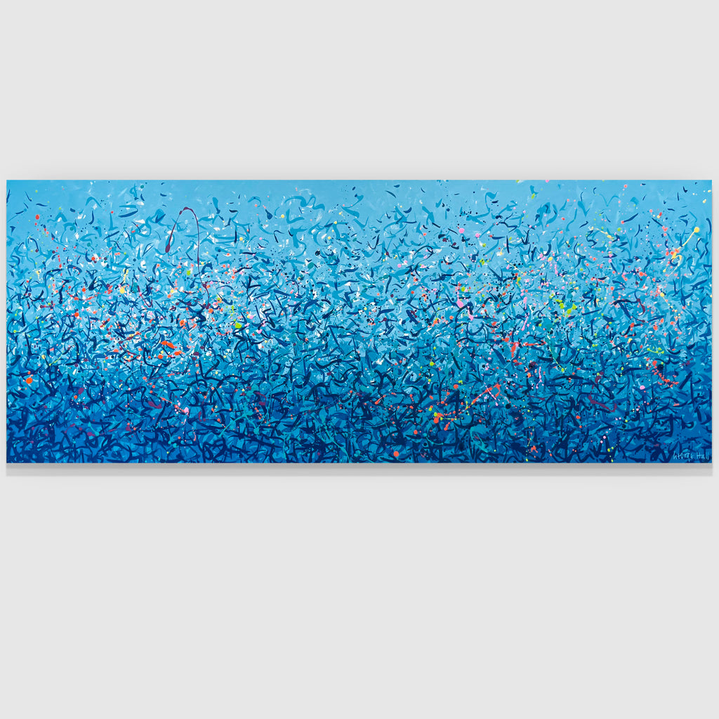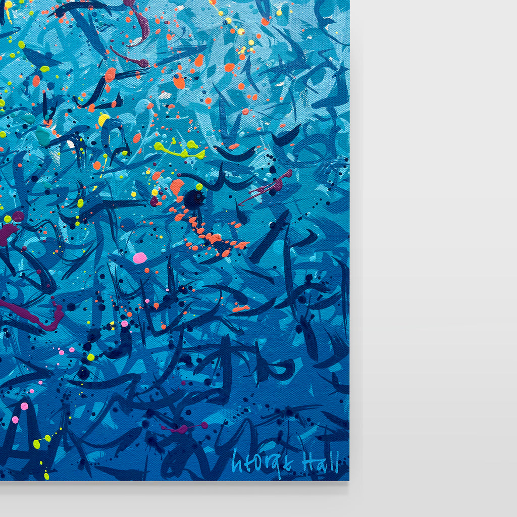 'Palm Cove Water Dance' is a painting that was inspired by Palm Cove, located in Queensland Australia. It is a detailed painting with colour crossing over one another to create effect. For this particular painting I have added in bright neon splatters. This is a painting to express how nature is free to do whatever it wants, without expectations. It is specific to the colours of Palm Cove and how they intertwine creating a dance of their own. It is not intended to be too literal and so allows you to see whatever you can find.