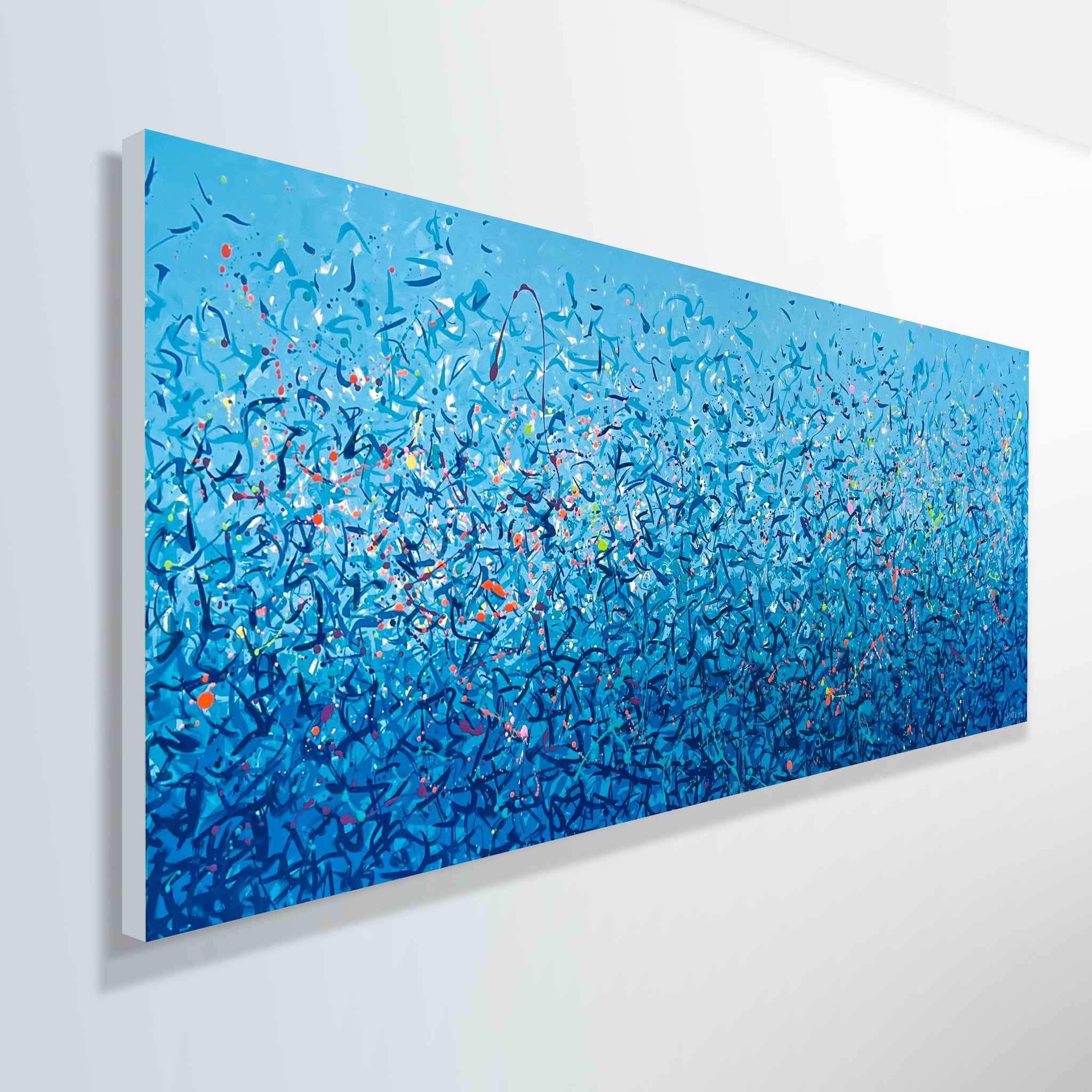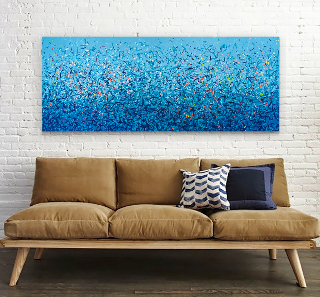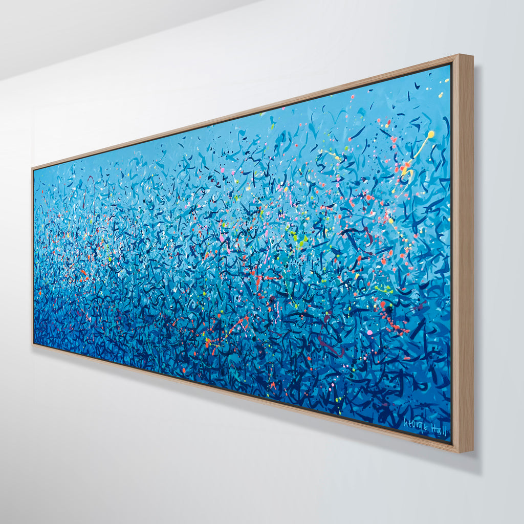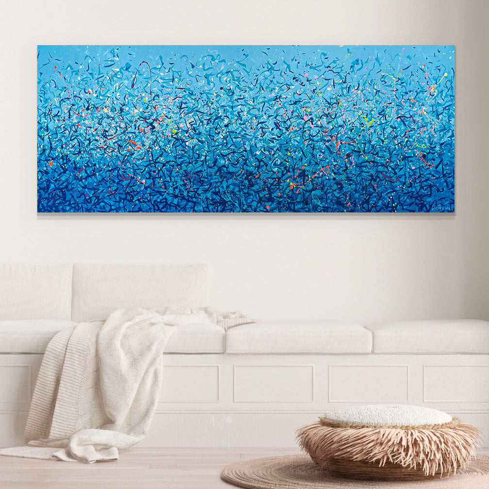 'Palm Cove Water Dance' is a painting that was inspired by Palm Cove, located in Queensland Australia. It is a detailed painting with colour crossing over one another to create effect. For this particular painting I have added in bright neon splatters. This is a painting to express how nature is free to do whatever it wants, without expectations. It is specific to the colours of Palm Cove and how they intertwine creating a dance of their own. It is not intended to be too literal and so allows you to see whatever you can find.