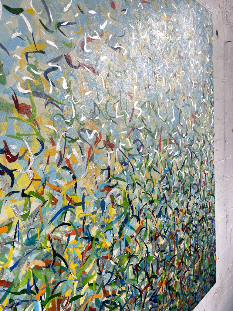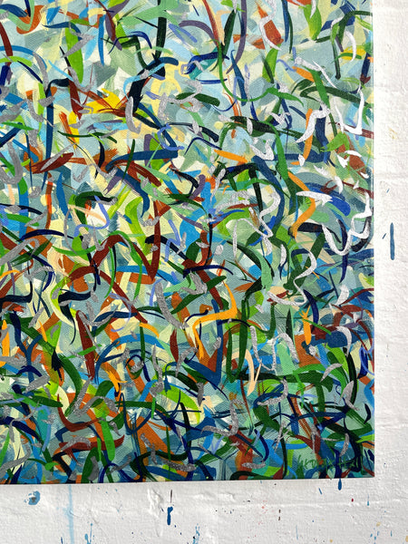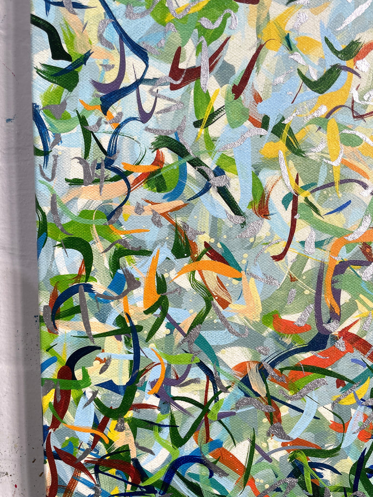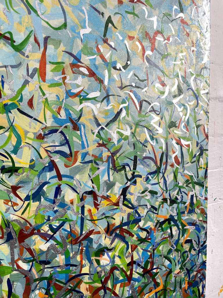 'Silver Garden A' is a mixed media work incorporating polymer inks, acrylic paint and polymer glazing. This a very detailed artwork with colour crossing over one another to create effect. An artwork to express how nature is free to do whatever it wants, without expectations. These works are specific to the colours of the gardens in Woollahra NSW and how they intertwine creating a dance of their own. It is not intended to be too literal and so allows you to see whatever you can find.