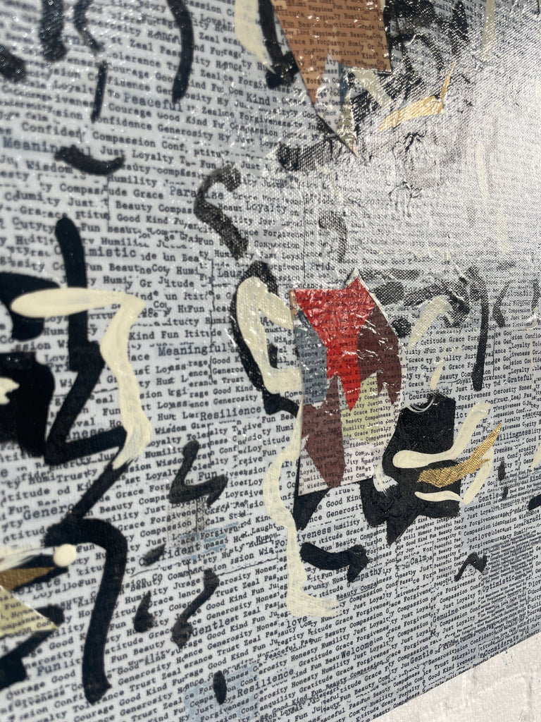 'The Golden Smile' by George Hall. This mixed media painting was inspired by my childhood in Fiji. The Fijians were the most smiley people and it was contagious, I love being around them as they sung songs and wove grass mats. They sometimes had missing teeth or a gold one, which meant you were obviously further up in the hierarchy, hence the name. The background is made up of positive, affirming words and collage.