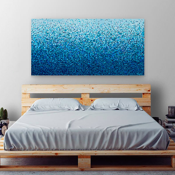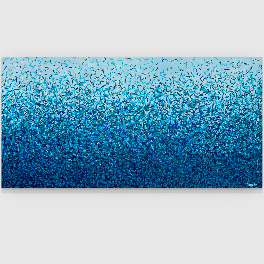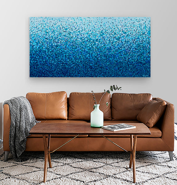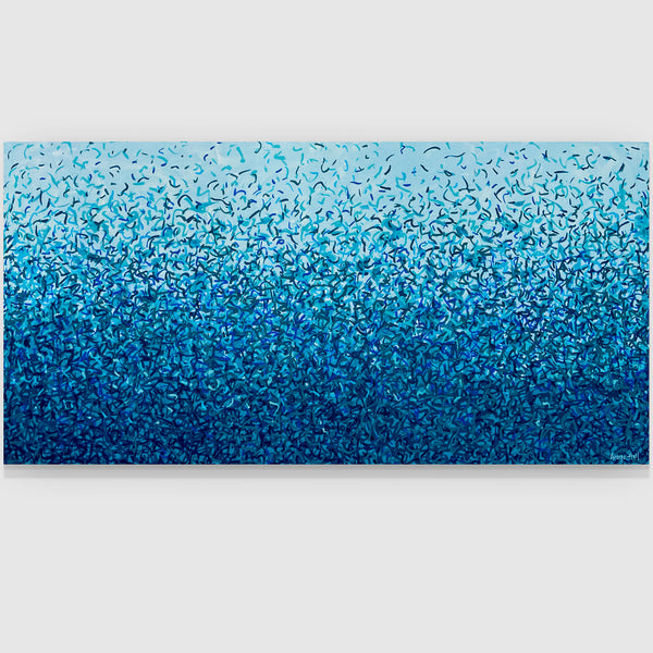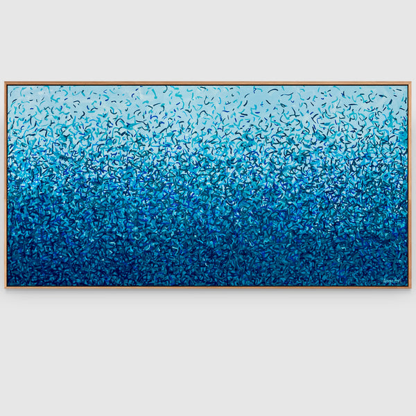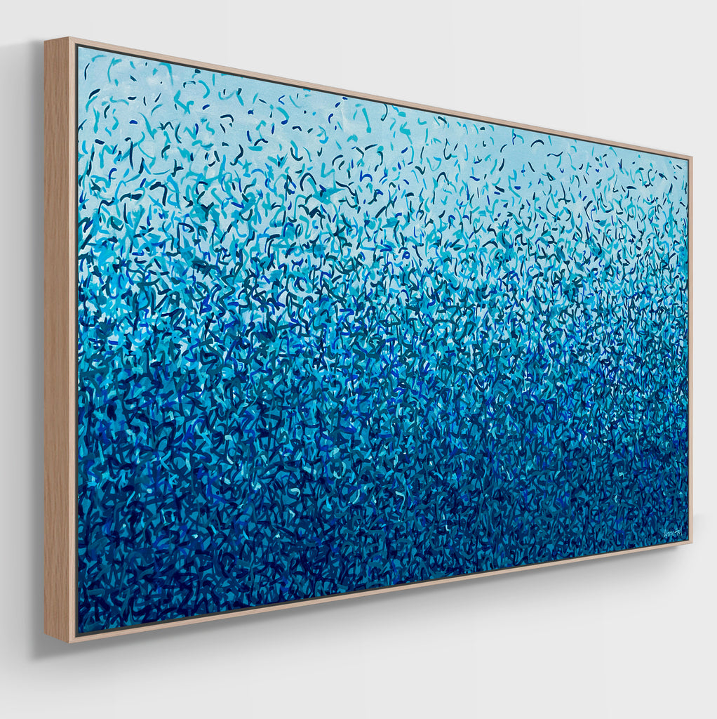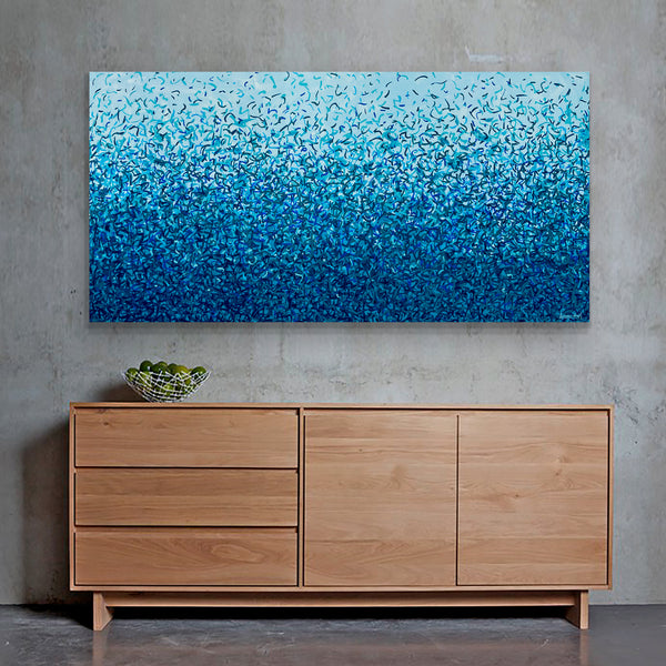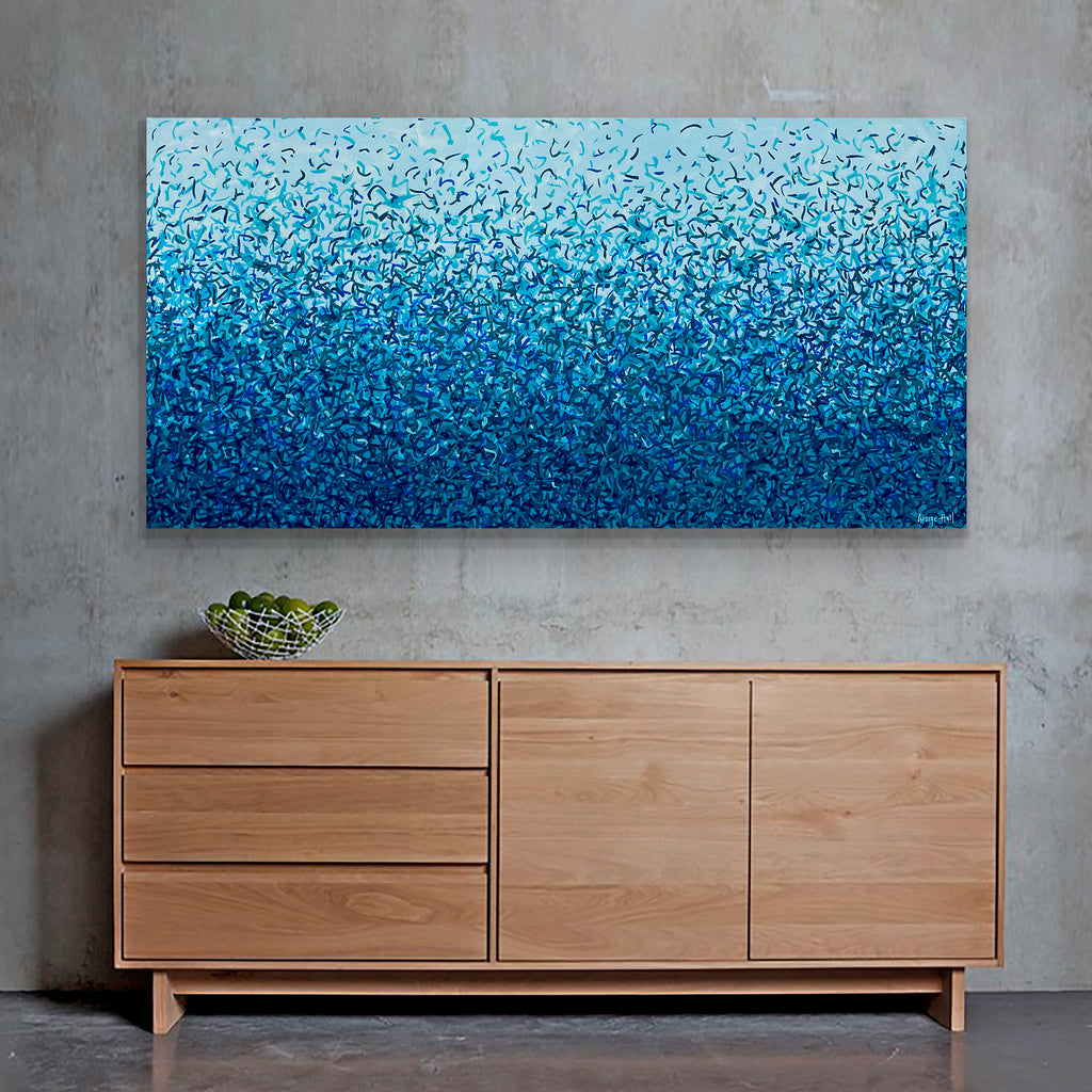 'The Maroubra Water Dance' is a very detailed painting with colour crossing over one another to create effect. A painting to express how nature is free to do whatever it wants, without expectations. This work is specific to the colours of Maroubra in NSW and how they intertwine creating a dance of their own. It is not intended to be too literal and so allows you to see whatever you can find.