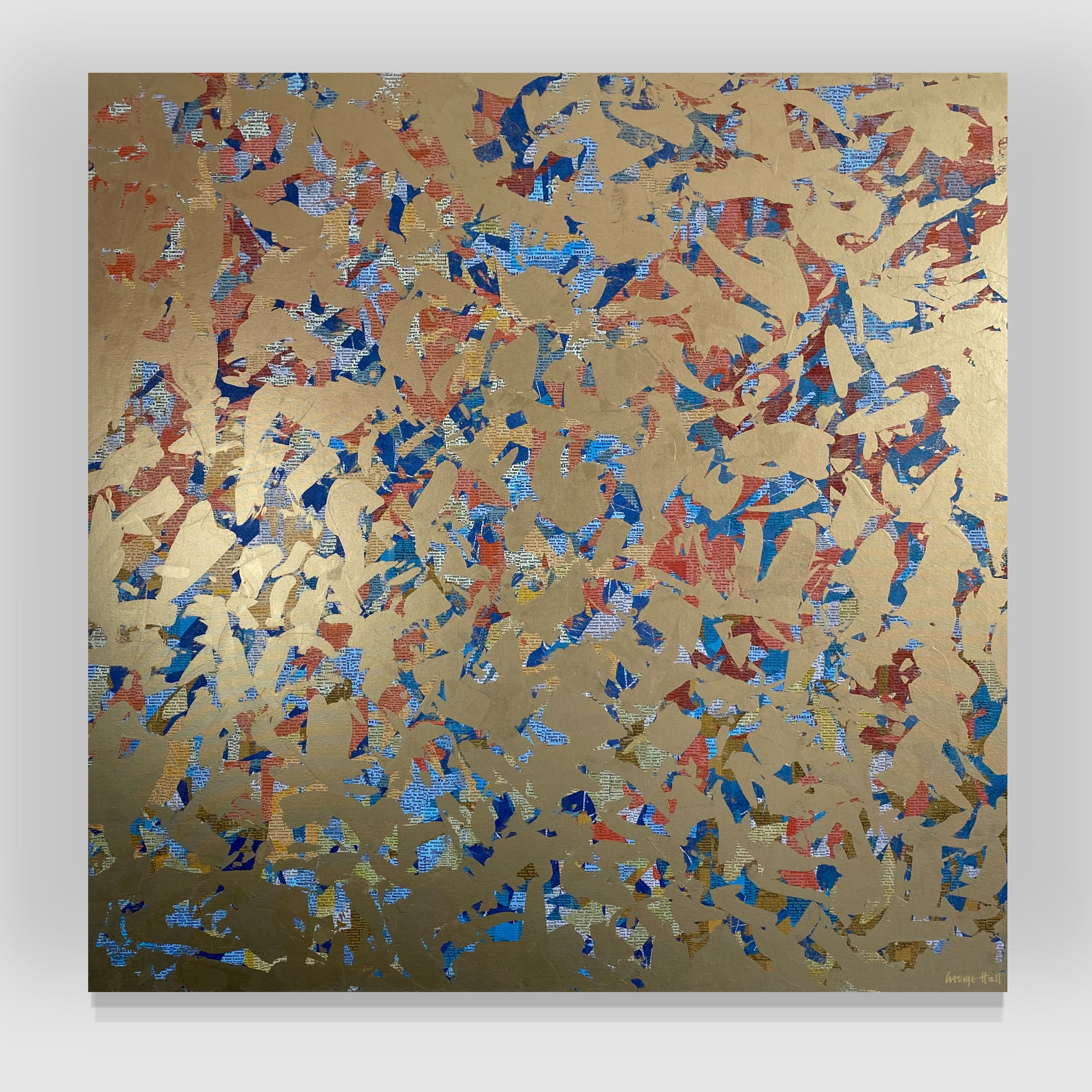 'Wisdom Four' by George Hall. The photographic printed background newsprint is made up of positive words, please look at the detailed photos to see this. I wanted to create the feeling of flight and movement to spread positivity and joy rather than what we seem to get in the news. Gold brings abundance, mental balance, and vitality. It helps learning and with the realization of self-potential. It will bring success, happiness, enthusiasm, and power. It will fill your life with comfort, kindness, and magic, making you more attuned to nature and the people around you. So being able to splash gold freely is a wonderful feeling of freedom.