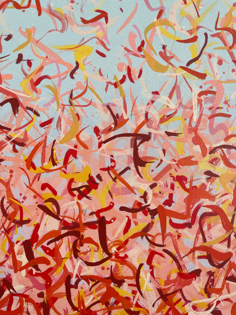 'Nullarbor Plain Road' is a very detailed painting with colour crossing over one another to create effect. A painting to express how nature is free to do whatever it wants, without expectations. This work is specific to the colours of The Nullarbor Plain in Australia and how they intertwine creating a dance of their own. It is not intended to be too literal and so allows you to see whatever you can find.