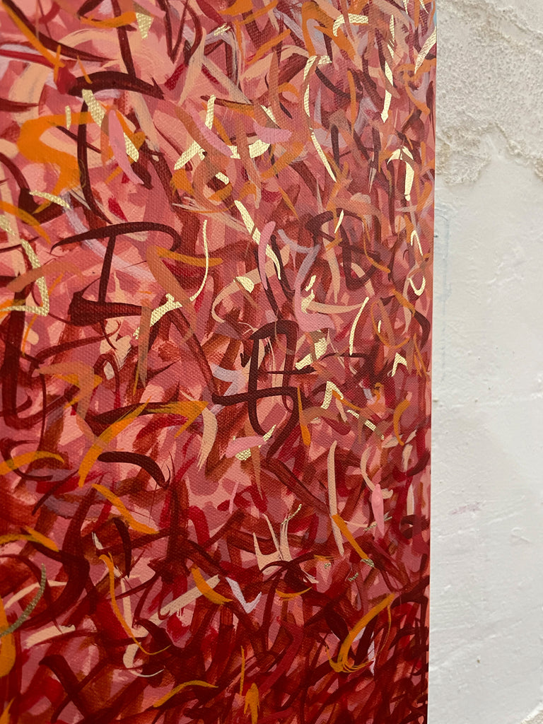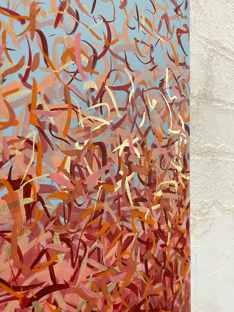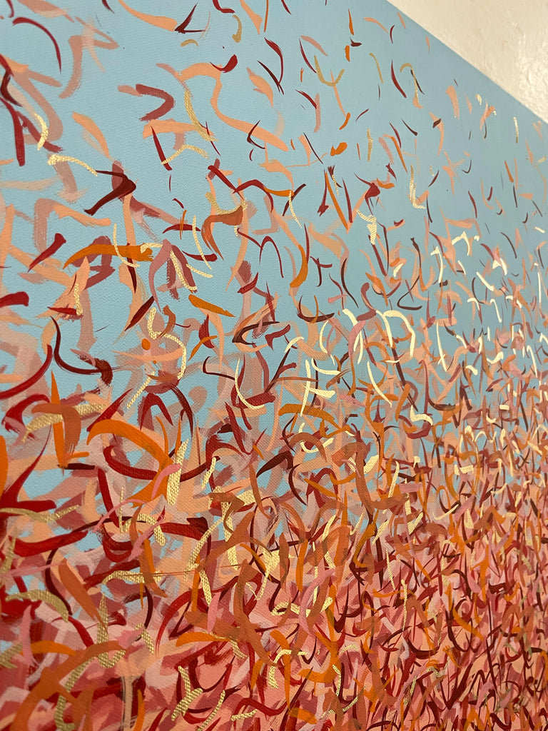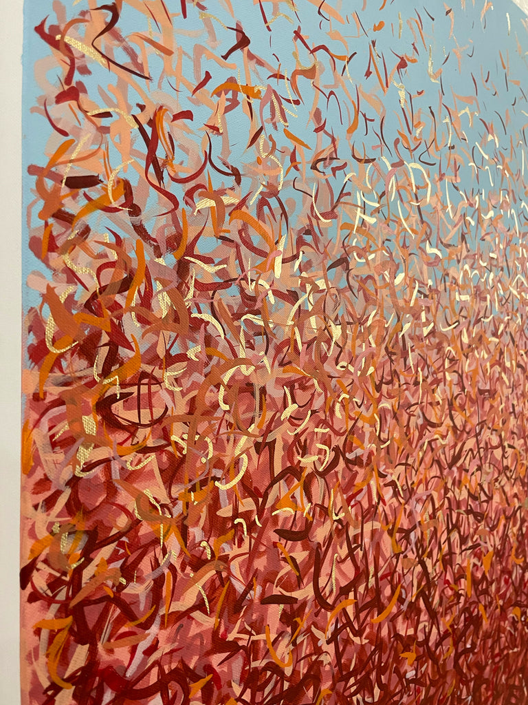 'Gold Oondiri' is a very detailed painting with colour crossing over one another to create effect. A painting to express how nature is free to do whatever it wants, without expectations. This work is specific to the colours of Uluru in the Northern Territory and how they intertwine creating a dance of their own. It is not intended to be too literal and so allows you to see whatever you can find.