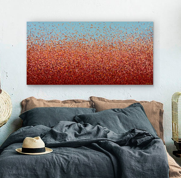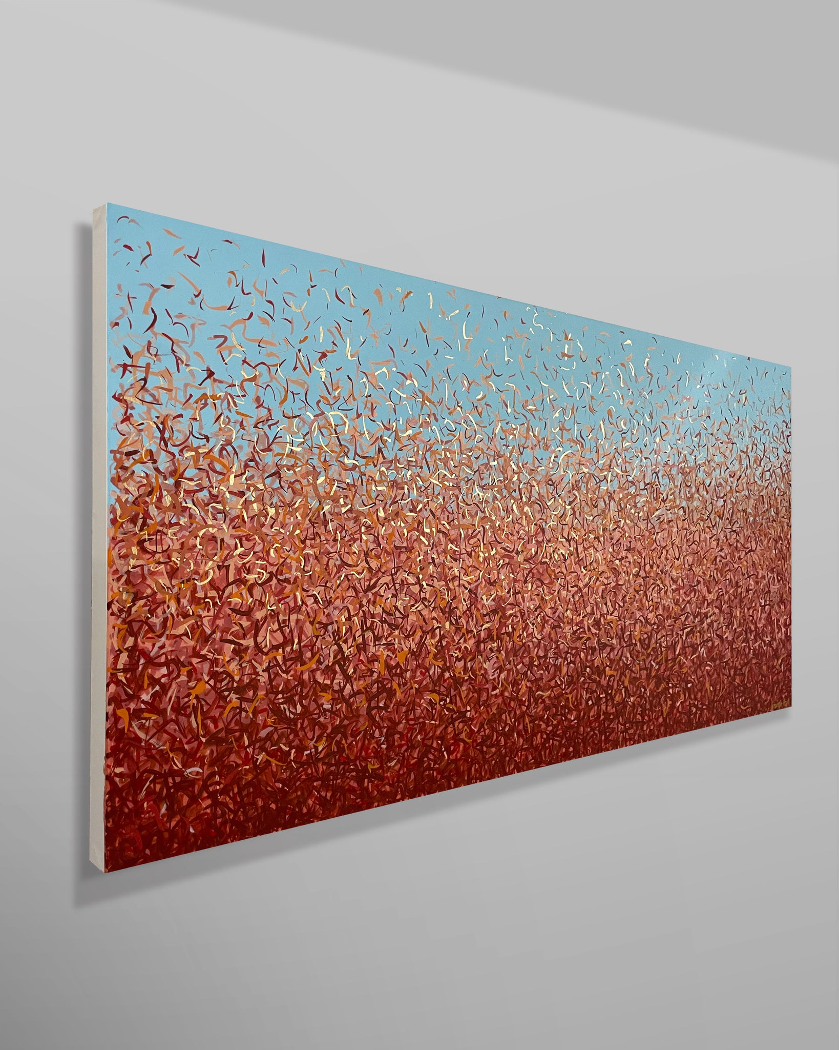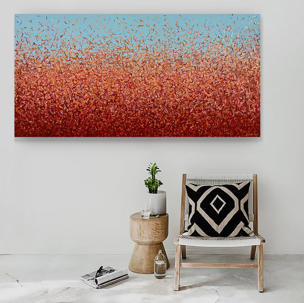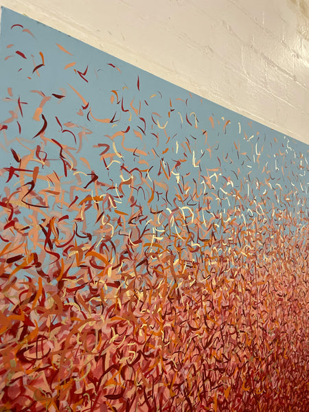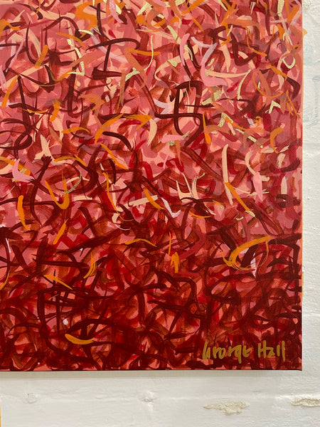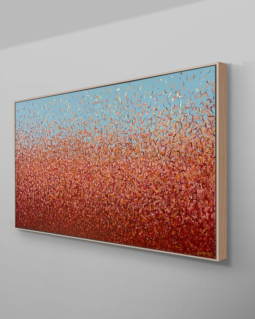 'Gold Oondiri' is a very detailed painting with colour crossing over one another to create effect. A painting to express how nature is free to do whatever it wants, without expectations. This work is specific to the colours of Uluru in the Northern Territory and how they intertwine creating a dance of their own. It is not intended to be too literal and so allows you to see whatever you can find.