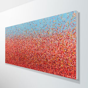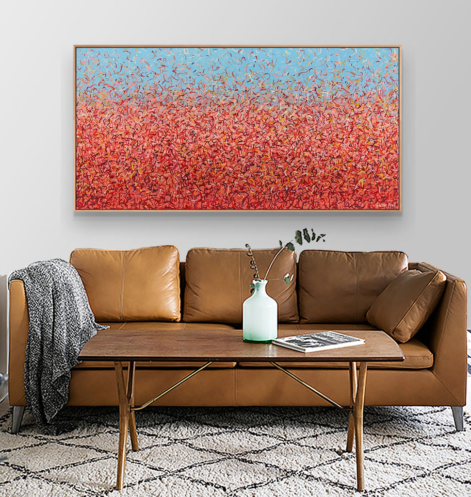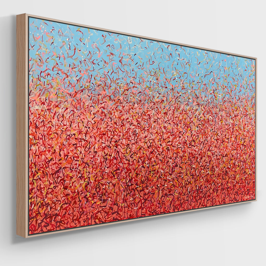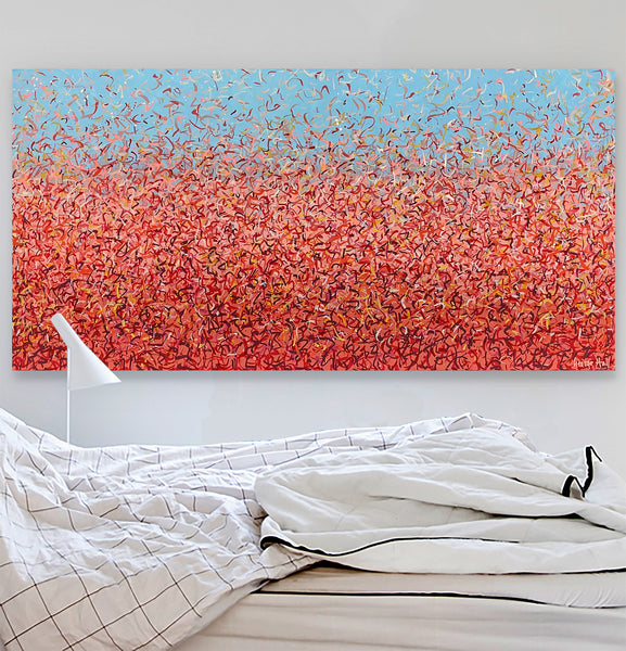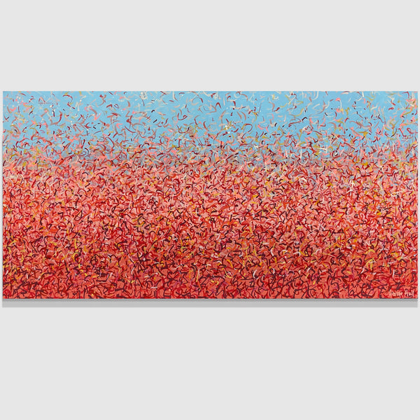 'Oondiri Lands' is a very detailed painting with colour crossing over one another to create effect. A painting to express how nature is free to do whatever it wants, without expectations. This work is specific to the colours of Uluru in the Northern Territory and how they intertwine creating a dance of their own. It is not intended to be too literal and so allows you to see whatever you can find.