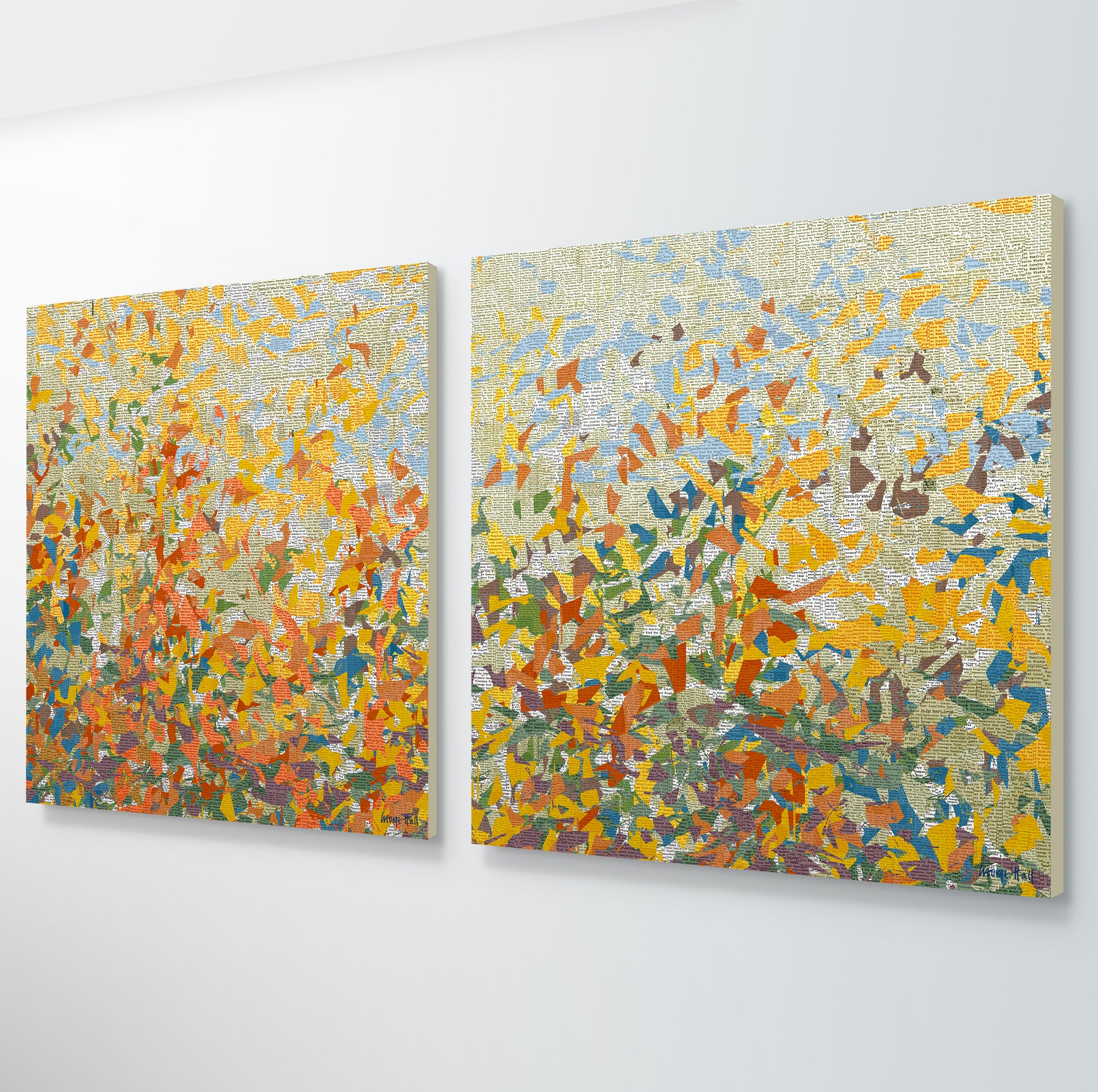 'Spring News Duo' comes as a set of 2 artworks which includes, 'Spring News A' and 'Spring News B'. Some days I just want to create a big colourful artwork. All the newsprint are made up of positive words, please look at the detailed photos to see this. I wanted to create the feeling of flight and movement to spread positivity and joy rather than what we seem to get in the news.